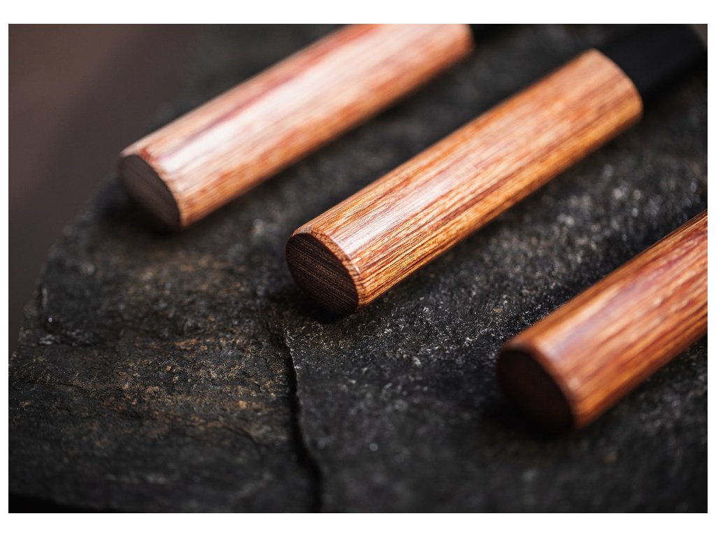 A minimalista japán esztétikát a pakka fából készült, lágy piros színű, elegáns markolat hangsúlyozza . A fához kiváló minőségű gyantát adnak, hogy az anyag különösen ellenálló legyen a nedvességgel szemben, így biztosítva a jobb stabilitást és a hosszú élettartamot.
