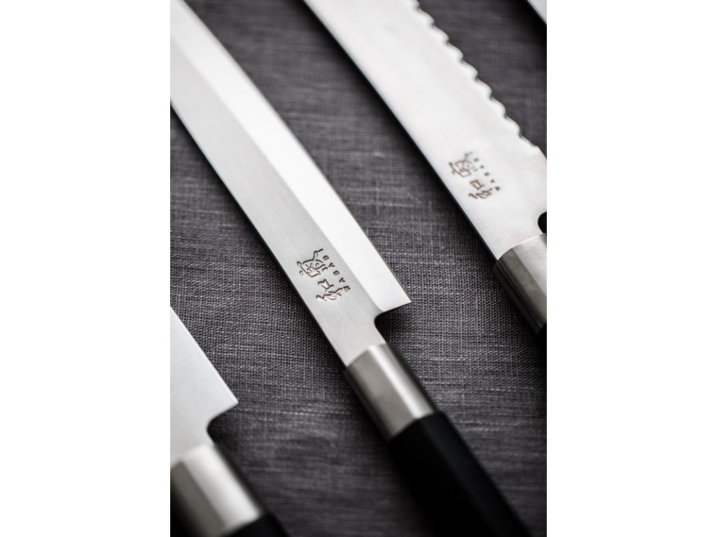 A kések tisztítása: Első használat előtt öblítse le a késeket forró vízben. Minden további használat után győződjön meg róla, hogy a késeket megfelelően, enyhe mosószerrel mossa el, és puha ruhával szárítsa meg. Saját biztonsága érdekében a késeket mindig a testtől távol törölje le. A kések használat utáni azonnali öblítése elengedhetetlen, különösen, ha savas ételekkel dolgozik. A japán kések nem valók a mosogatógépbe. A hosszan tartó élesség megőrzése érdekében mindig csak kézzel mosson.