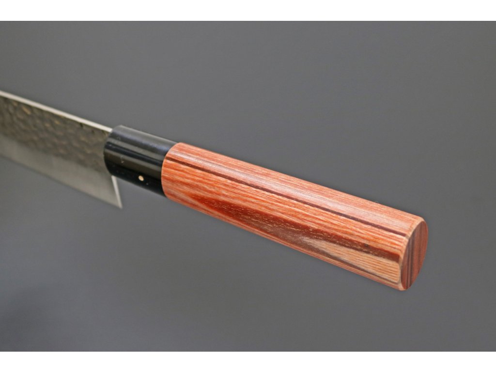 A kés teljes hossza 34 cm, így kiváló választás nagyobb mennyiségű alapanyag szeleteléséhez. 21 cm-es pengéje 58 HRC keménységű, ami hosszú éltartamot és kiváló élességet biztosít. A markolat Pakkawood fából készült, ami nemcsak esztétikusan elegáns, hanem biztos és kényelmes fogást is nyújt.