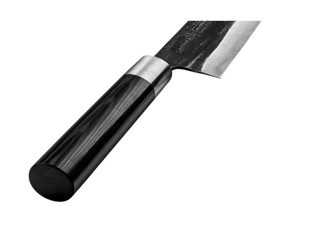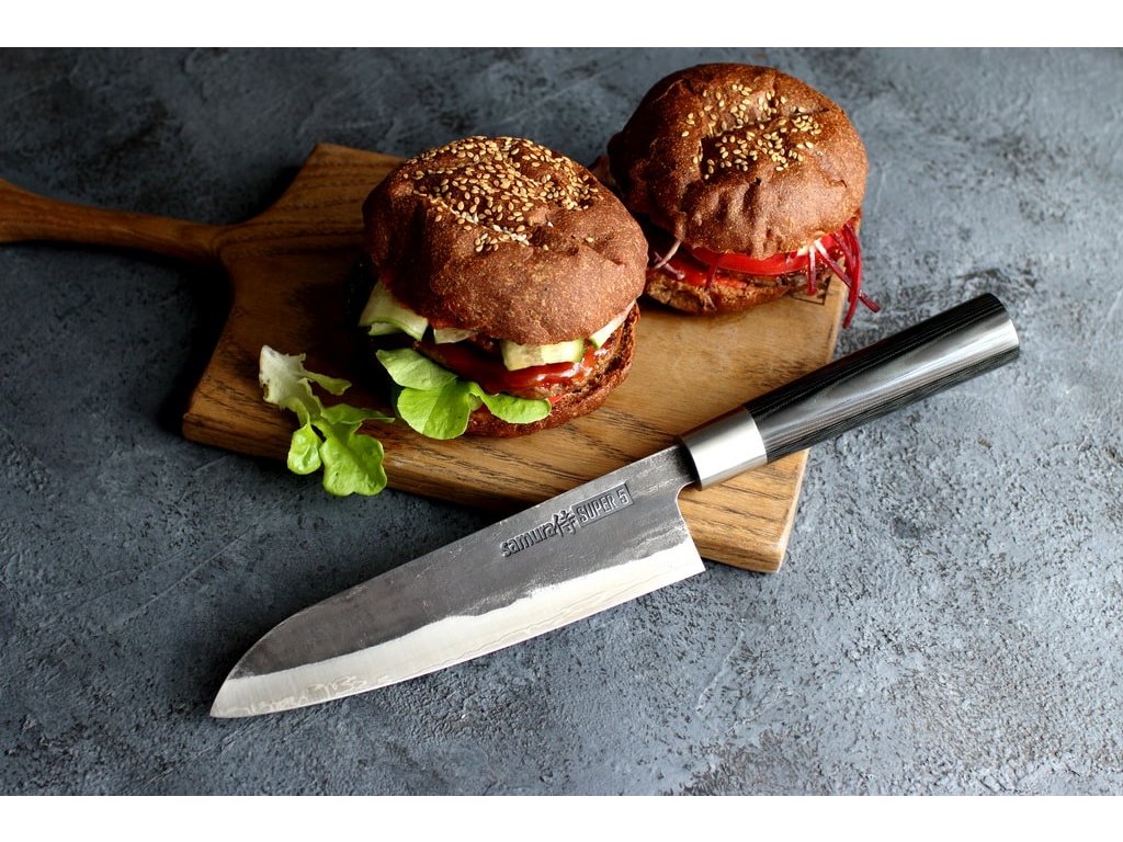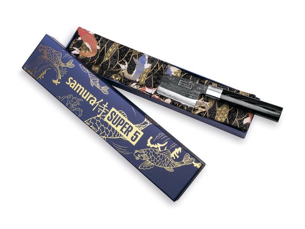 A Samura Super 5 kések exkluzív konyhai kések, amelyek hagyományos japán formákat kínálnak, tartós micarta kompozit markolattal és japán kézzel kovácsolt damaszk acél pengékkel (5 réteg), VG-10 acélmaggal. A VG-10 magja nagyon kemény és 61 HRC keménységet ér el. Ez a pengék nagyon hosszú ideig élesek maradnak. A kézi kovácsolt acél előnye a nagy tartósság és megbízhatóság, valamint a szokatlan megjelenés, mivel minden darab eredeti. A hammered steel felületkezelés nagyon vonzó és biztosítja a sima vágást anélkül, hogy a szeletelt étel tapadna a késhez. A kés egy nagyon szép japán stílusú vászon tasakba van csomagolva, aztán ajándékdobozba