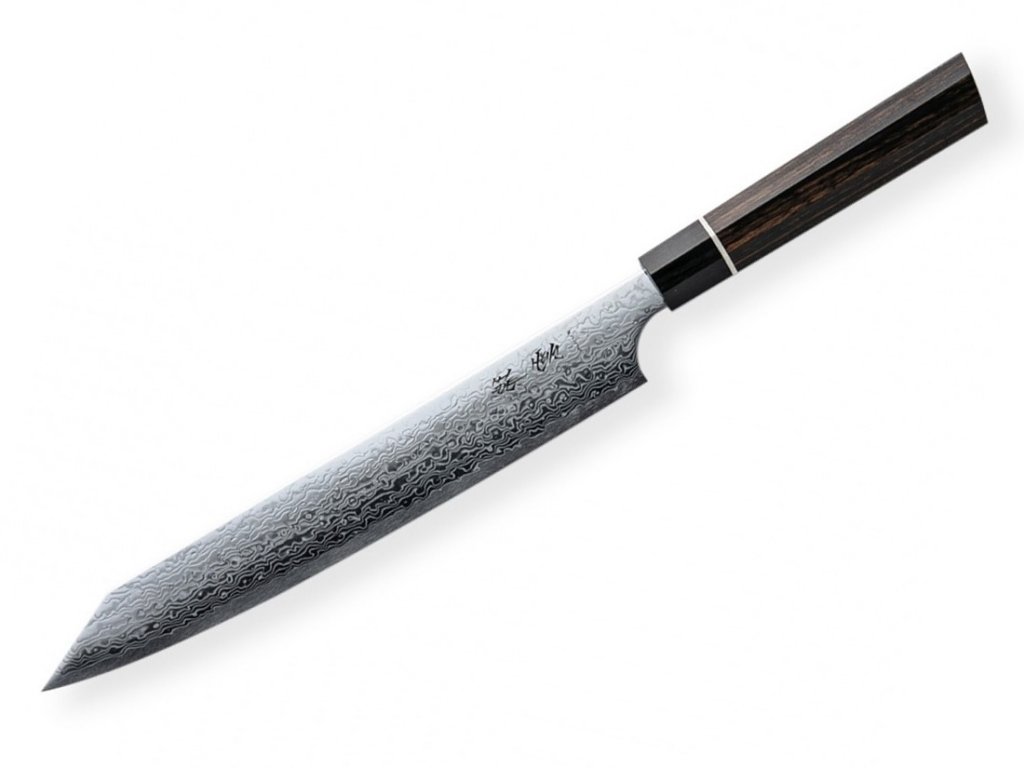 A japán Sujihiki kés kézenfekvő választás az Ön számára, ha vékonyra kell szeletelnie a hozzávalókat, vagy otthonról, kényelmesen elkészítheti kedvenc sushiját. A damaszkuszi acél használata minden kést különleges és utánozhatatlan darabbá tesz.