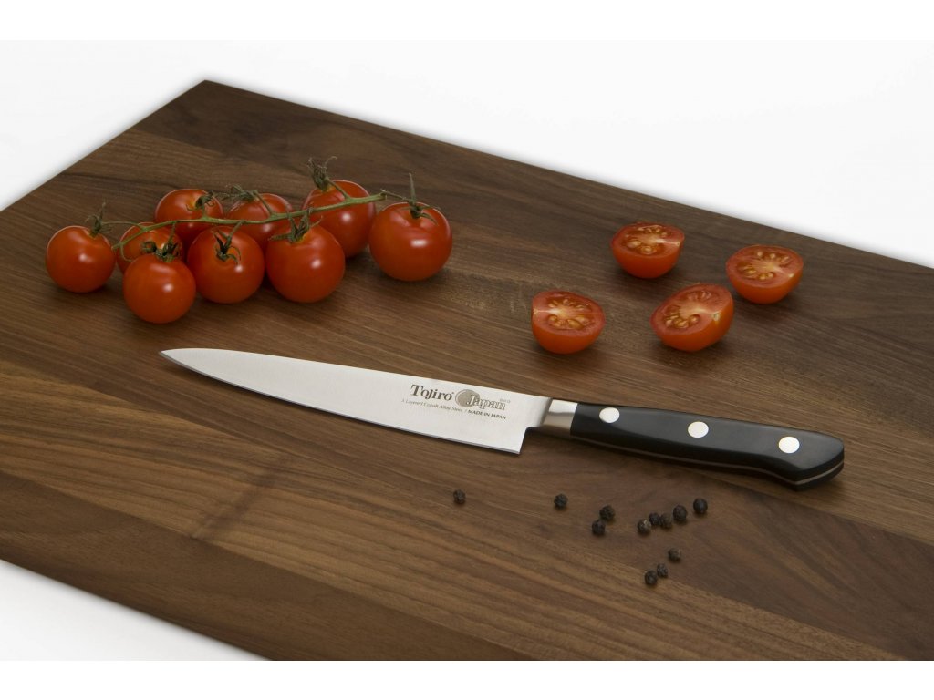 Hagyományos japán konyhakés Tojiro DP VG10 Petty típusú egy univerzális kés, különösen alkalmas a mindennapi konyhában végzett munkákhoz. A maximális élesség érdekében a penge magja nagyon kemény japán VG-10-es rozsdamentes acélból készül, amely 2 réteg krómozott rozsdamentes acél közé kerül. A rendkívül éles, 15 cm-es penge olyan tevékenységekhez is használható, mint a hús felnyársalása vagy a kedvenc szalámi szeletelése.