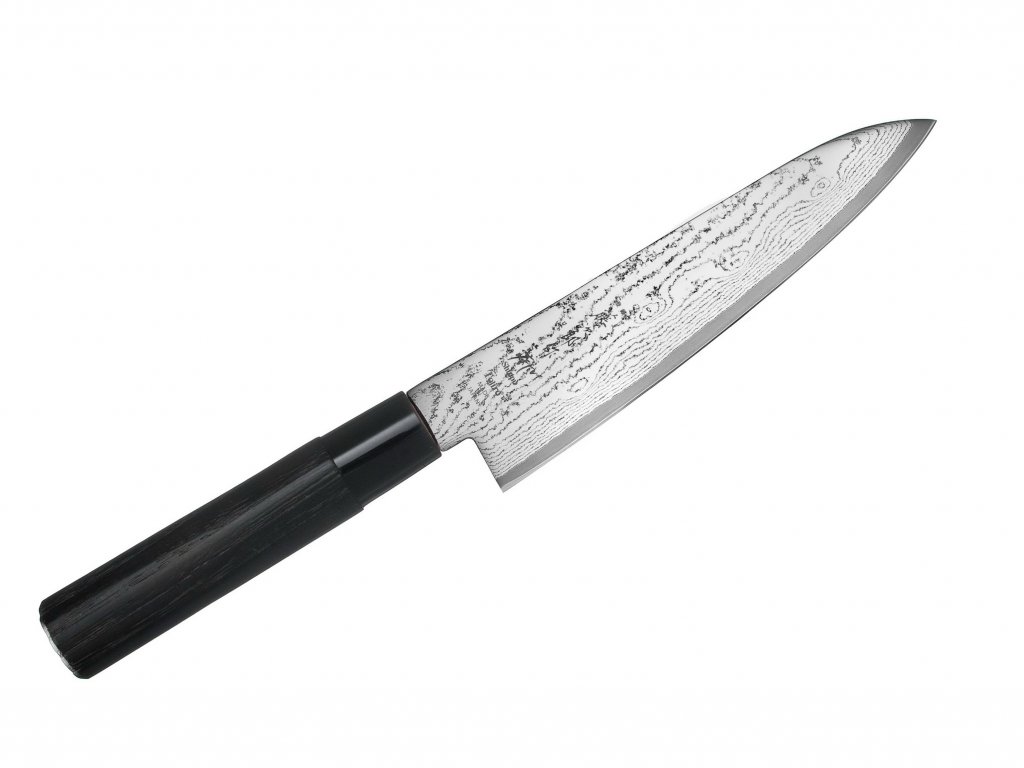 A Tojiro Shippu Black FD-1593 egy Gyuto típusú japán konyhakés - szakácskés, 18 cm hosszú damaszkuszi acél pengével, VG-10 rozsdamentes acél maggal. A D alakú gesztenyefa nyél nagyon kellemes tapintású. A markolat polipropilén gyűrűvel van ellátva. Szakácskés széles pengével a hús, hal és zöldség gyors és hatékony vágásához.