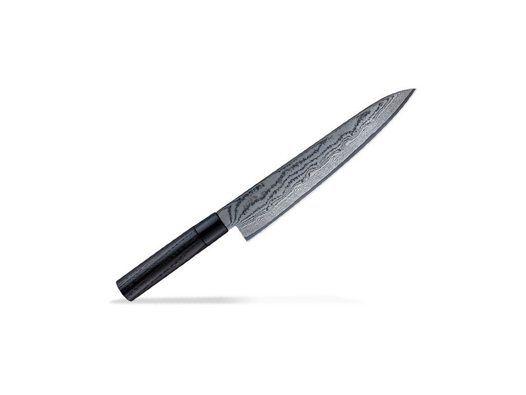 A Tojiro Shippu Black FD-1596 egy Gyuto típusú japán konyhakés - nagy szakácskés, 27 cm hosszú, damaszkuszi acél pengével, VG-10 rozsdamentes acél maggal. A D alakú gesztenyefa nyél nagyon kellemes tapintású. A markolat polipropilén gyűrűvel van ellátva. Szakácskés széles pengével a hús, hal és zöldség gyors és hatékony vágásához.