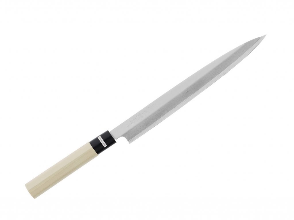 Hagyományos japán Yanagiba típusú konyhai kés 24 cm hosszú pengével, első osztályú japán Shirogami acélból (más néven fehér papíracél). A D alakú magnóliafa nyél nagyon kellemes tapintású. A markolat műgyantából készült gyűrűvel van ellátva. A yanagiba kés hagyományos japán késforma. Ideális vékony szeletek precíz vágására, ezért hallal való megmunkáláshoz, sushi és sashimi készítéséhez is használható.