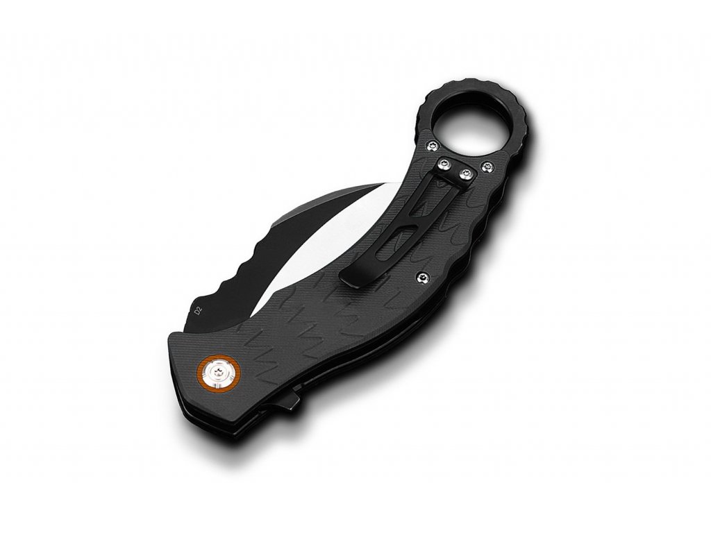 A záró karambit QSP Eagle egy megbízható kés minőségi anyagokból. A penge D2 szerszámacélból készül. A 3,2 mm vastag penge szatén felülettel és lapos élezéssel rendelkezik. A penge kerámia csapágyakra van felszerelve. A markolat fekete G10-ből készült. A kés liner lock zárral és acél klipsszel van felszerelve a felakasztáshoz. Flipper típusú nyitás.