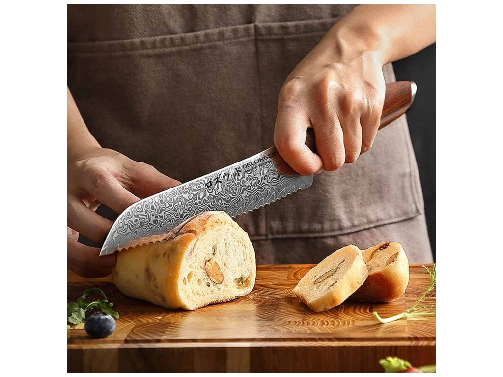 Extrémisan éles Dellinger Rosewood Bread Damascus kés kenyér és péksütemények szeleteléséhez, 21 cm-es pengével, kiváló minőségű damaszkuszi acélból. A rendkívül hosszú és erős penge ideális kenyér vagy kedvenc péksütemények vágásához. Felejtse el a hosszadalmas és végtelen szeletelést – a fogazott él villámgyors és könnyed vágást biztosít. A kést különösen értékelni fogják a finom házi péksüteményeket sütő mesterek, akik tökéletes szeletekre vágják alkotásaikat. Alapvető eszköz minden konyhában, ahol a friss péksütemény illata a jó nap kezdetét jelenti.