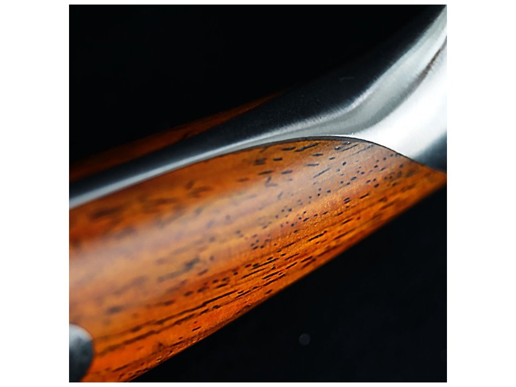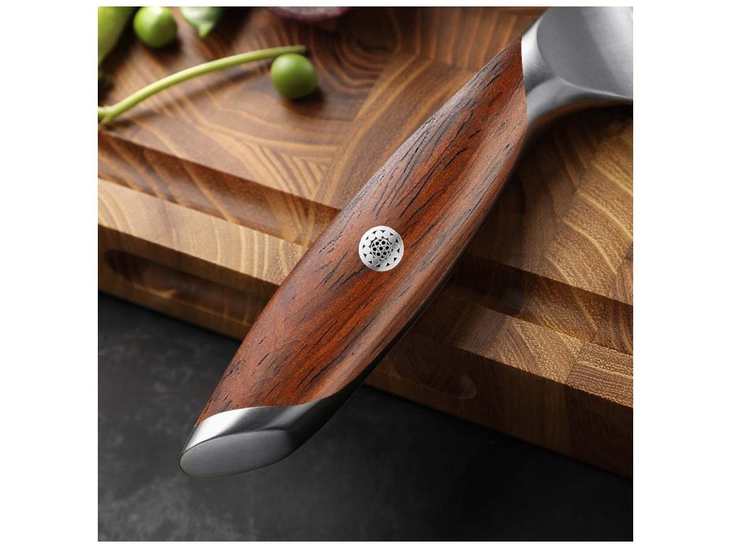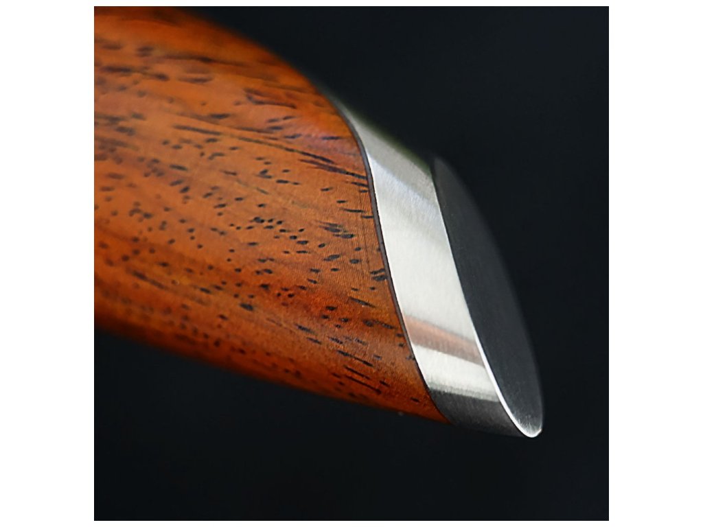 A kés markolata rózsafa anyagból készült, és egy kisebb mozaik díszítéssel van ellátva. A kés fogása mindig maximálisan kényelmes lesz az ergonomikus kialakításnak köszönhetően. A speciális forma az ázsiai késstílusokat idézheti.