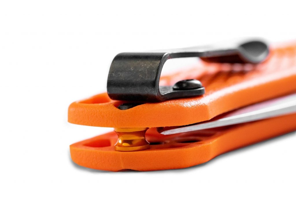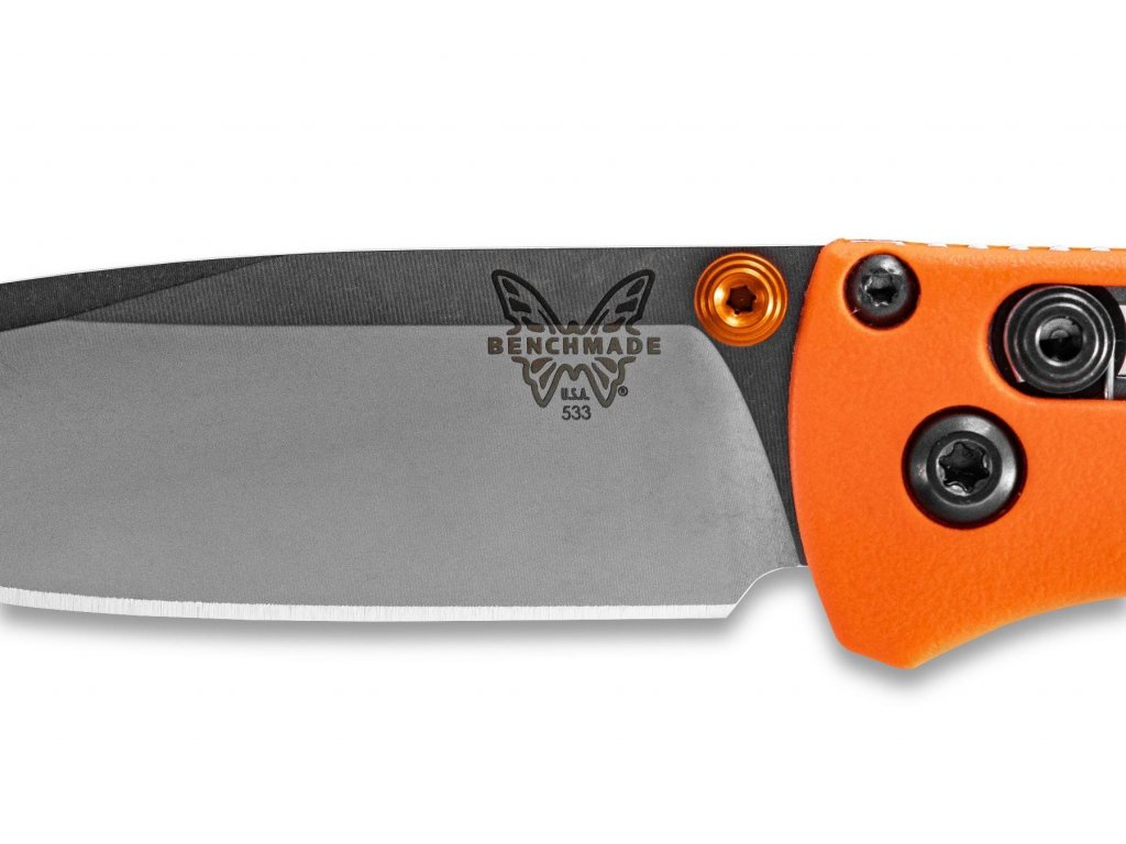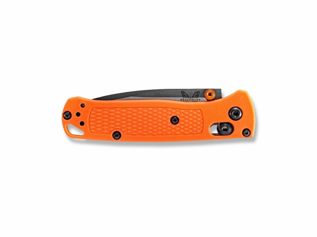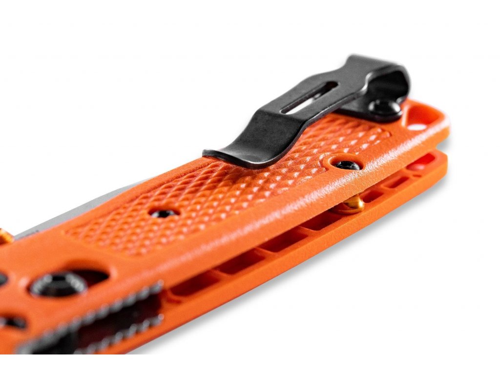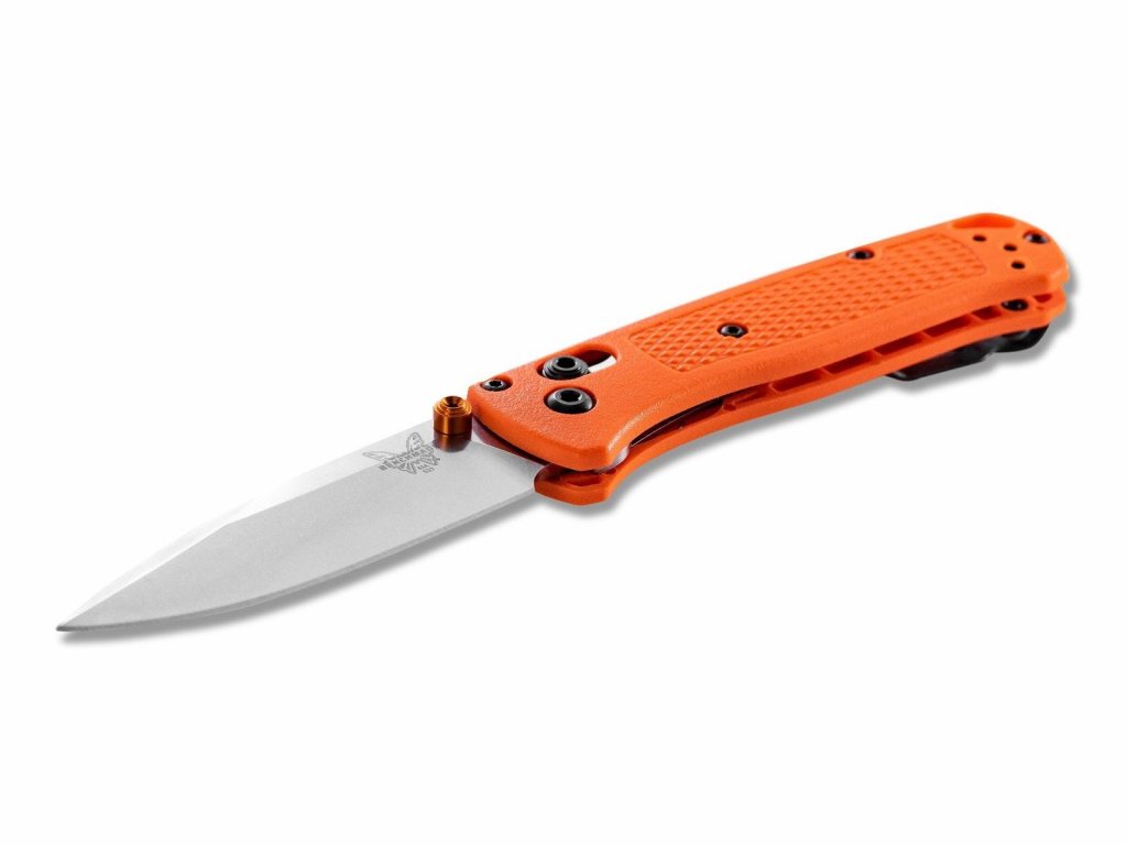 A Mini Bugout a népszerű Bugout modell kisebb verziója. Ugyanolyan első osztályú anyagokból készül, mint a nagyobb testvére, könnyű, vékony és egyúttal ergonomikus is. A 7,16 cm hosszú penge prémium minőségű rozsdamentes acélból készült CPM-S30V (58-60 HRC keménységű), matt felületű, lapos élezésű és süllyesztett alakú. Grivory markolat (rendkívül erős műanyag, hőre lágyuló poliamidok és gyanta kombinációjából) narancssárga színben. A kés akasztóval rendelkezik (billenhető), amely mindkét oldalon megfordítható. A kés ezért jobbkezes és balkezes számára egyaránt alkalmas. Axis Lock típusú biztosíték, nagy lyuk a zsinórhoz - zsinórrudak. Egykezes nyílás tűvel a pengén.