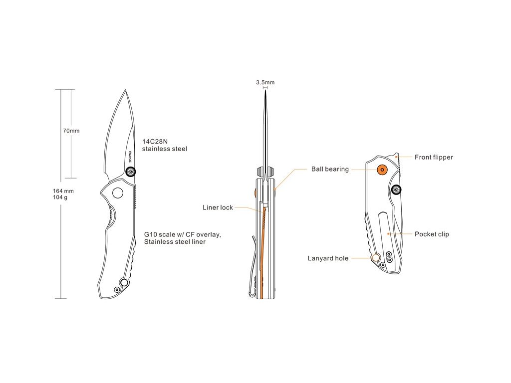 Kisebb bicska front flipperrel, mindennapi használatra. A 3,5 mm vastag Sandvik 14C28N rozsdamentes acél kriogén penge lapos élezésű és 7 cm hosszú. A matt felületű penge a csapágyakra van felszerelve, ami valóban megkönnyíti a kés kinyitását. Markolat szénszálas réteggel bevont G10-ből. A kést betétzárral rögzítik.