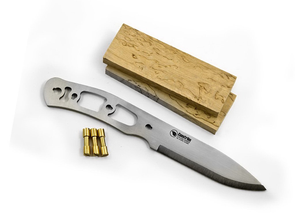 Szett a Casström No. 10 kés házi gyártásához. A készlet külön pengét tartalmaz a Casström No. késhez. 10 SFK vastagság 3,8 mm Sandvik 14C28N rozsdamentes acélból. A penge full tang kialakítású és skandináv élezésű. A teljes hossza 22 cm, maga a penge hossza 10 cm. Göndör nyírfa késnyél-tartozékok gyártásához. A csomag 2 darabot tartalmaz. A nyírfa a leggyakrabban használt anyag a skandináv késmarkolatokhoz. A készlet 3 db sárgaréz szegecset is tartalmaz.