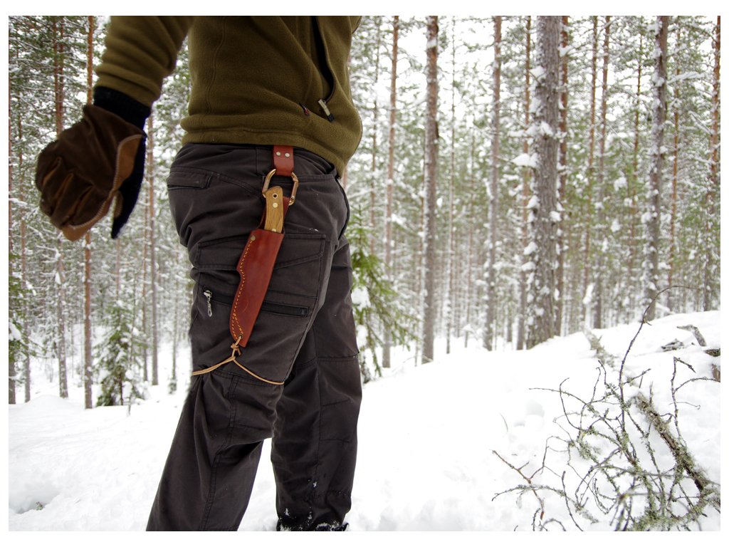 Bőr karabinnel akasztó késtokhoz. Lehetővé teszi a kés alacsony és magas akasztását, így akkor is könnyedén elérheti a kést, arra az esetre ha hosszú kabátja vagy hátizsákja van. Ezenkívül a csuklópántnak köszönhetően a kés ülés közben nincs útban. A karabiner 8 mm vastag alumíniumból készült. Az akasztó barna, természetes cserzett bőrből készült, és legfeljebb 5 cm vastag övekhez alkalmas. A karabiner max. 3,4 cm.