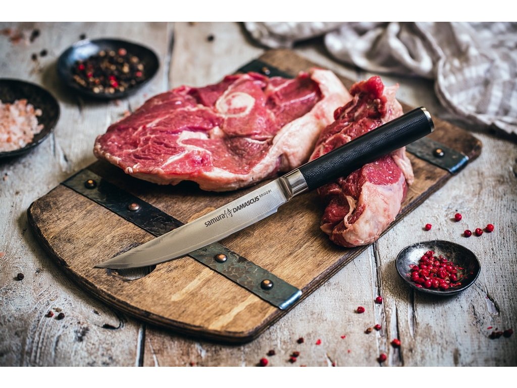 A Samura Damascus konyhai kések valódi ékszer a konyhai kések között. Egyesítik a vékony és rendkívül éles japán damaszk acél pengét (67 acélréteg, keménység 61 HRC-ig) és egy szilárd G10 kerek markolatot. Jól kiegyensúlyozottak, kiváló minőségűek és figyelemre méltóak a minimalista dizájnnal. Szép dobozban vannak, tehát ajándékként is alkalmasak.