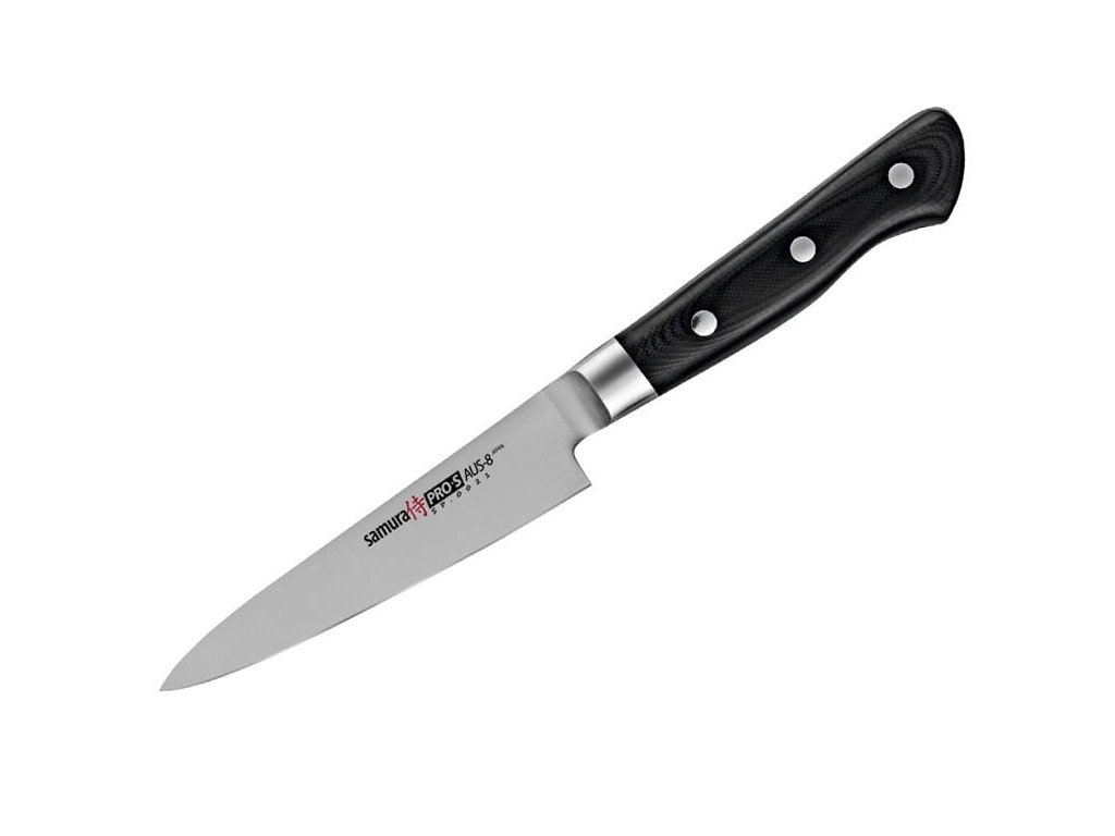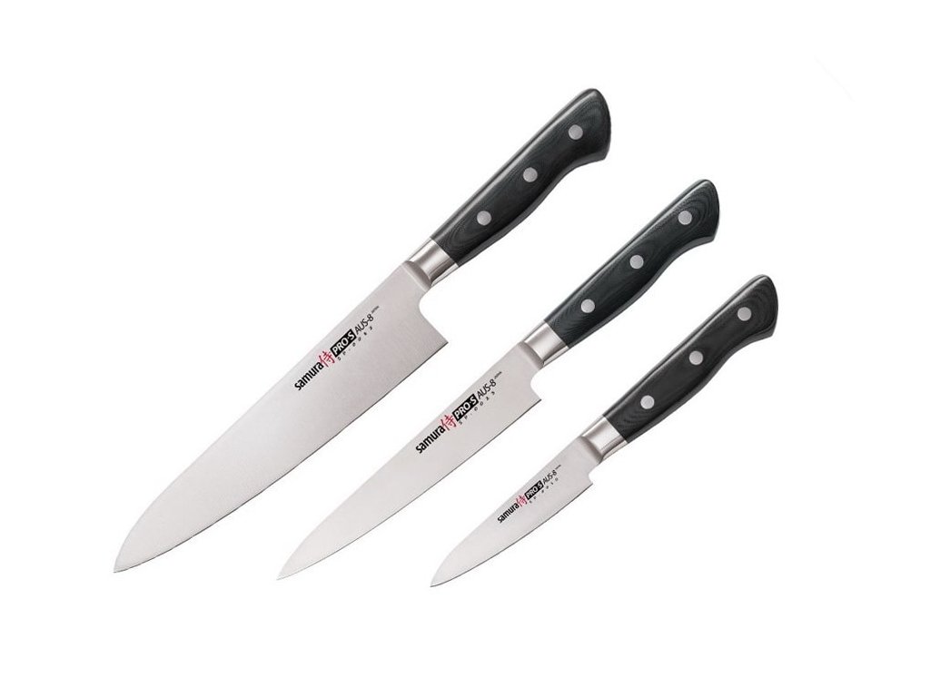 Samura konyhakések szett a PRO-S modellcsaládból. A Samura PRO-S konyhakések egy rendkívül éles, japán AUS-8 rozsdamentes acélból készült penge és egy G10 kompozit anyagból készült masszív markolat kombinációját kínálják. Jól kiegyensúlyozottak, nagyon jó minőségűek és szemet gyönyörködtetőek. Szép dobozban érkeznek, így ajándéknak is megfelelnek. A készlet 3 kést tartalmaz - séfkést, univerzális kést és zöldségkést.
