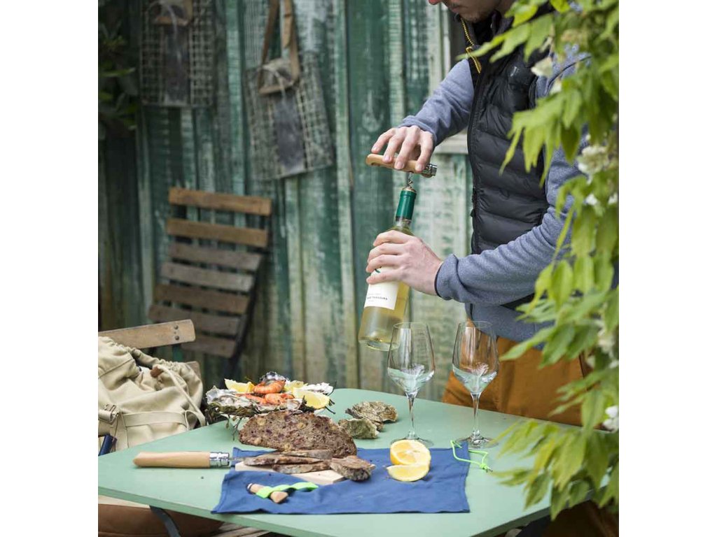 A sima pengéjű kés pengehossza 10 cm, és tartalmaz egy dugóhúzót is a parafadugók kinyitásához.