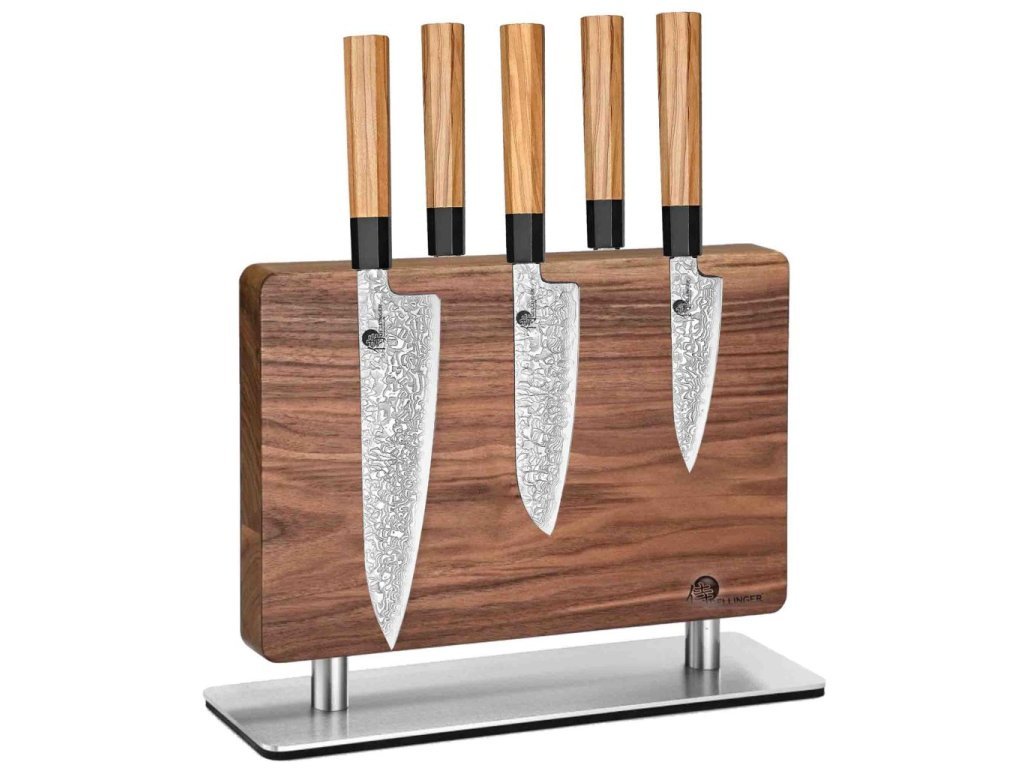 A Dellinger diófából készült mágneses késállványa biztosítja, hogy kései rendezetten és biztonságosan legyenek tárolva. A tartó óriási praktikussággal rendelkezik, mivel mindkét oldalán tárolhatja a késeket. Az állvány legalább 8 késnek vagy más konyhai eszköznek biztosít helyet. Az acél talp maximális stabilitást biztosít, így nem kell aggódnia amiatt, hogy az állvány könnyen felborul a konyhapulton. A rozsdamentes acél alap alját kiváló minőségű csúszásgátló gumiborítás egészíti ki, így biztosítva, hogy szilárdan álljon a konyhapulton. Emellett a kések mindig kéznél vannak, a penge pedig jól védve van a nem kívánt tompulás ellen.