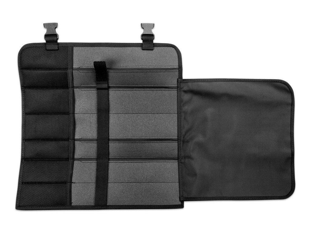 A markolatokat a megfelelő tartókba csíptetheti. A késeket tépőzárral rögzítheted, hogy ne mozogjanak a táskádban. A táska kényelmes fogantyúval és vállpánttal rendelkezik, hogy hosszabb távokon is kényelmesen hordozható legyen.
