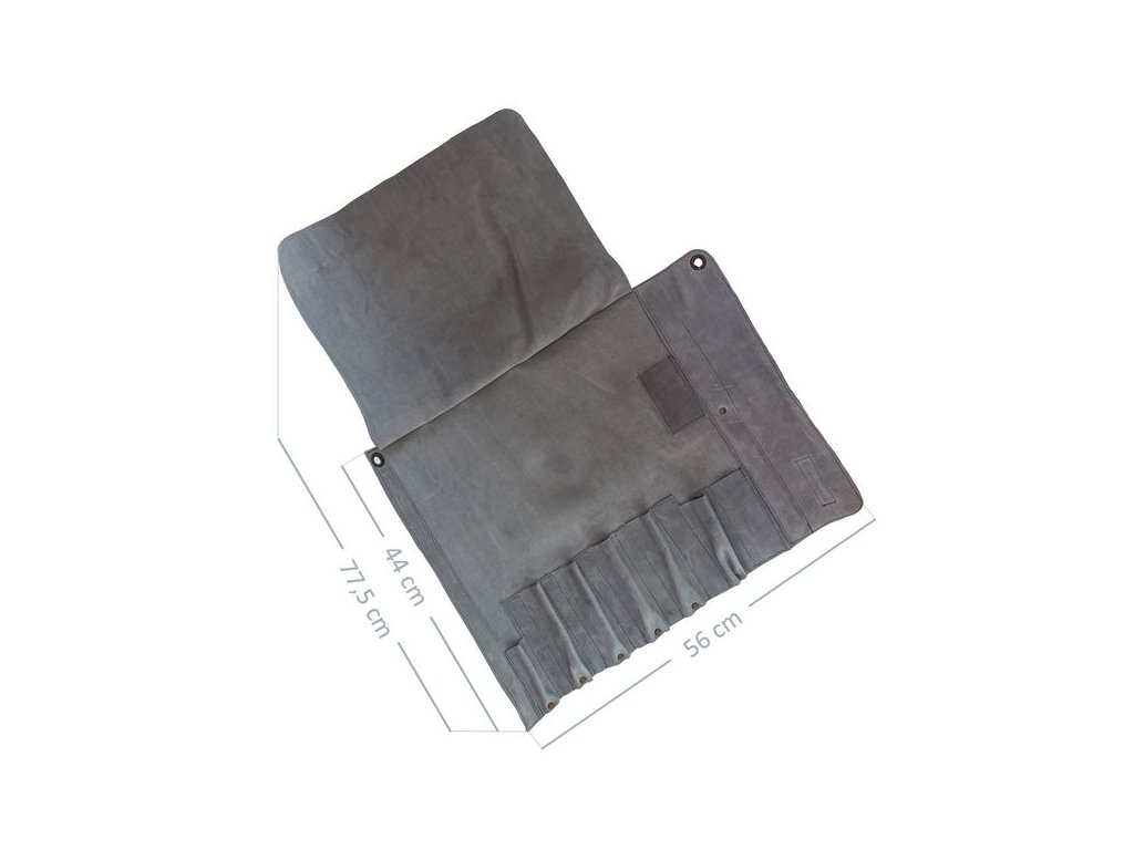 A Samura Leather Roll luxus bőrtok konyhai késekhez, első osztályú tömör bőrből készült, nagyon finom felülettel,szürke kivitelben. Ez a bőr guruló késtáska alkalmas konyhai kések tárolására és szállítására. A kések a helyükön maradnak és nem sérülnek meg. A tokban akár hét különböző méretű kést is tárolhat. Ide akár 40 cm-es kések is elférnek. A kibontott tok mérete 57 x 44 cm, súlya 755 g.
