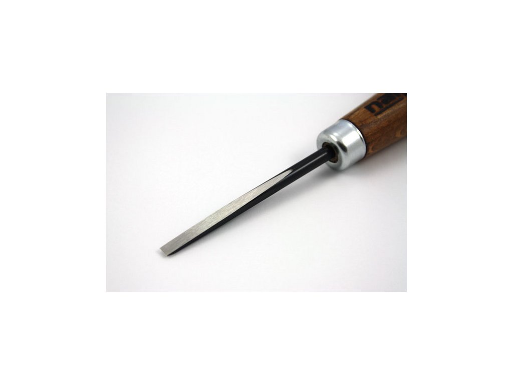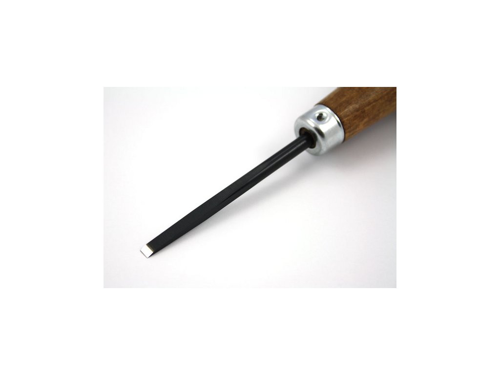 Egyenes lapos vésők egyszerű bevágásokhoz, domborművekhez és kontúrok faragásához. Kiváló befejező eszközök. Az ásó félkörte alakú markolatotal rendelkezik, ami jelentősen nagyobb kontrollt biztosít a faragáshoz, és lehetővé teszi a nehezen elérhető faterületek könnyebb kifaragását. Az ásó penge 61-62 HRC keménységig edzett króm-vanádium acélból készül. A penge hossza 7 cm, a markolat mérete 8,2 x 4 cm, a vágóél szélessége 4 mm.