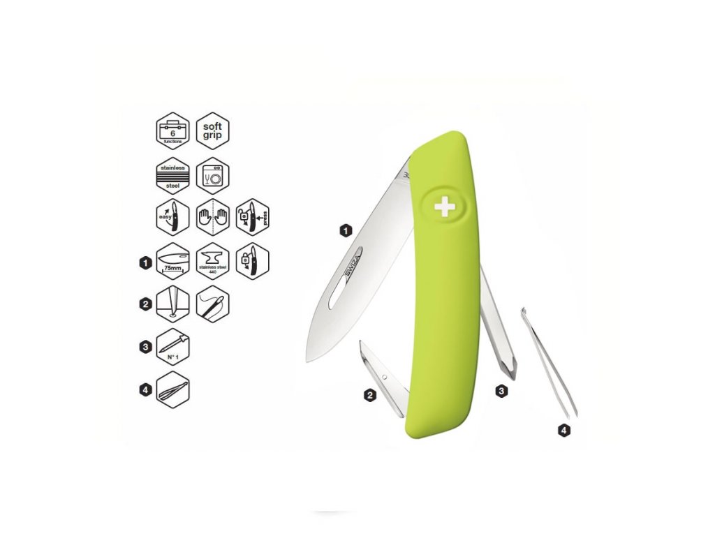 Az első dolog, amit azonnal észrevesz a késsel kapcsolatban, az a modern és ergonomikus kialakítás. Az innovatív elemek még a linerlock biztosítékára nézve is könnyen felismerhetők. A kés kinyitása egyszerű – csak nyomja meg a nyélen lévő logót. A Swiza a balkezes felhasználók kényelméről is gondoskodott, és bevezetett egy kivágást a pengében, amely mindkét oldalról használható. A Swiza D02 egy praktikus zsebkés, amely felelősségteljesen kezeli az Ön előtt álló kihívásokat. Gumírozott textúrájú puha polimer markolata még nehéz körülmények között is kiváló tapadást és ugyanakkor kényelmet biztosít, felülmúlva a piacon kapható többi zsebkést. Sárga-zöld markolat. Az drop point alakú penge kiváló minőségű 440-es rozsdamentes acélból készült, fényes matt felülettel 7,5 cm hosszban. A kés zárt állapotban 9,5 cm hosszú, így nagyon könnyen hordozható.