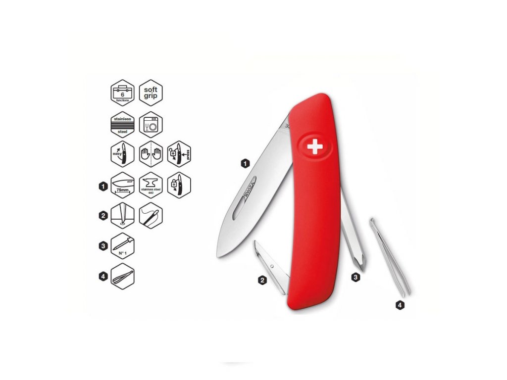 Az első dolog, amit azonnal észrevesz a késnél, az a modern és ergonomikus kialakítás. Az innovatív elemek még a linerlock biztosítékára nézve is könnyen felismerhetők. A kés kinyitása egyszerű – csak nyomja meg a nyélen lévő logót. A Swiza a balkezes felhasználók kényelméről is gondoskodott, és bevezetett egy kivágást a pengében, amely mindkét oldalról használható. A Swiza D02 egy praktikus zsebkés, amely felelősségteljesen kezeli az Ön előtt álló kihívásokat. Gumírozott textúrájú puha polimer markolata még nehéz körülmények között is kiváló tapadást és ugyanakkor kényelmet biztosít, felülmúlva a piacon kapható többi zsebkést. Piros markolat. Az drop point alakú penge kiváló minőségű 440-es rozsdamentes acélból készült, fényes matt felülettel 7,5 cm hosszban. A kés zárt állapotban 9,5 cm hosszú, így nagyon könnyen hordozható.