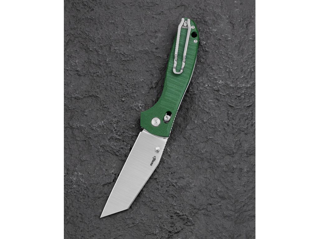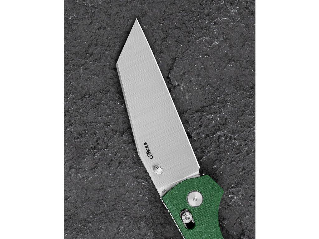 Kivételesen masszív összecsukható kés mindennapi használatra. A penge D2 szerszámacélból készült, szatén felületkezeléssel, és wharncliffe alakú, lapos éllel rendelkezik. A penge kerámia golyóscsapágyakon fut, melyek sima nyitást biztosítanak. A penge vastagsága 3,5 mm, hossza 9,16 cm.
