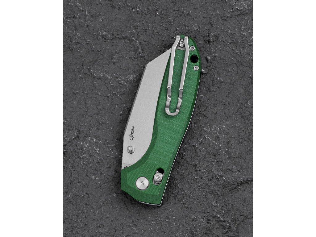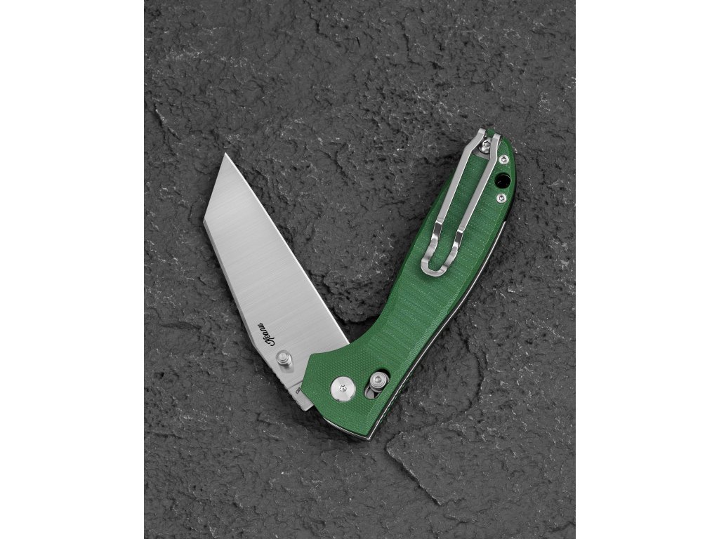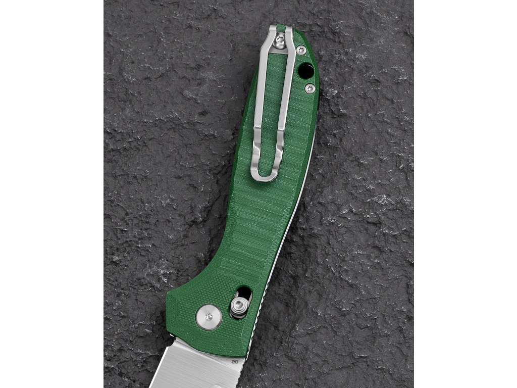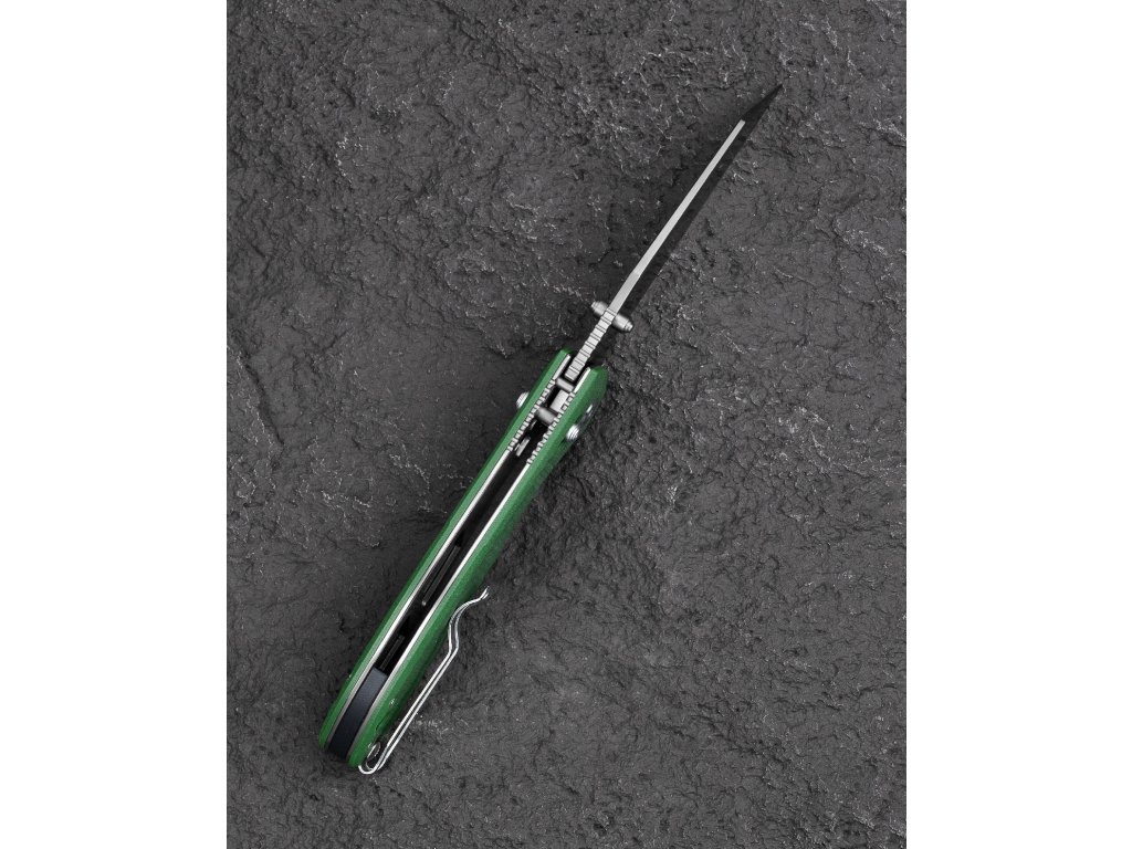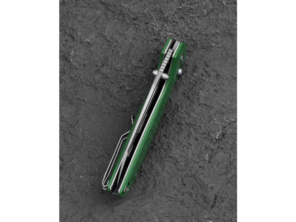 A markolat zöld G10-ből készült, textúrázott a biztosabb fogás érdekében, hossza 12,16 cm. Egykezes nyitás hüvelykujj-kioldóval (thumb stud), nyitott állapotban pedig Bar Lock (Axis) zárral rögzített. A markolaton zsinórfurat (lanyard hole) található. A kés deep carry Tip-Up klippel van felszerelve, ami mind jobb-, mind balkezesek számára ideális. A kés teljes hossza 21,32 cm, súlya 130 g. A kést Keanu Alfaro tervezte.