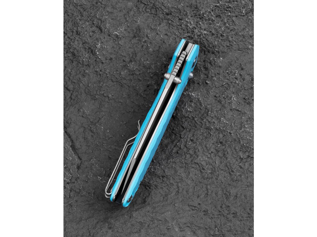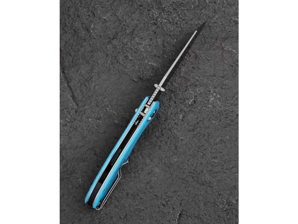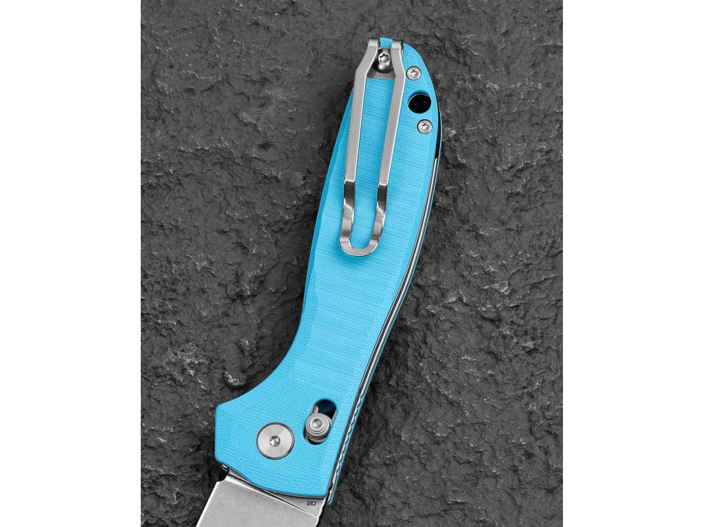 A markolat világoskék G10 anyagból készült, textúrázott a jobb fogás érdekében, a markolat hossza 12,16 cm. Egykezes nyitás a penge hüvelykujj-karral (thumb stud), nyitott állapotban a penge zárolását Bar Lock (Axis) biztosítja. A markolaton fűzőlyuk található (lanyard hole). A kés deep carry Tip-Up klippel rendelkezik, amely alkalmas jobb- és balkezesek számára is. A teljes hossz 21,32 cm. A kés tömege 130 g. A kést Keanu Alfaro tervezte.
