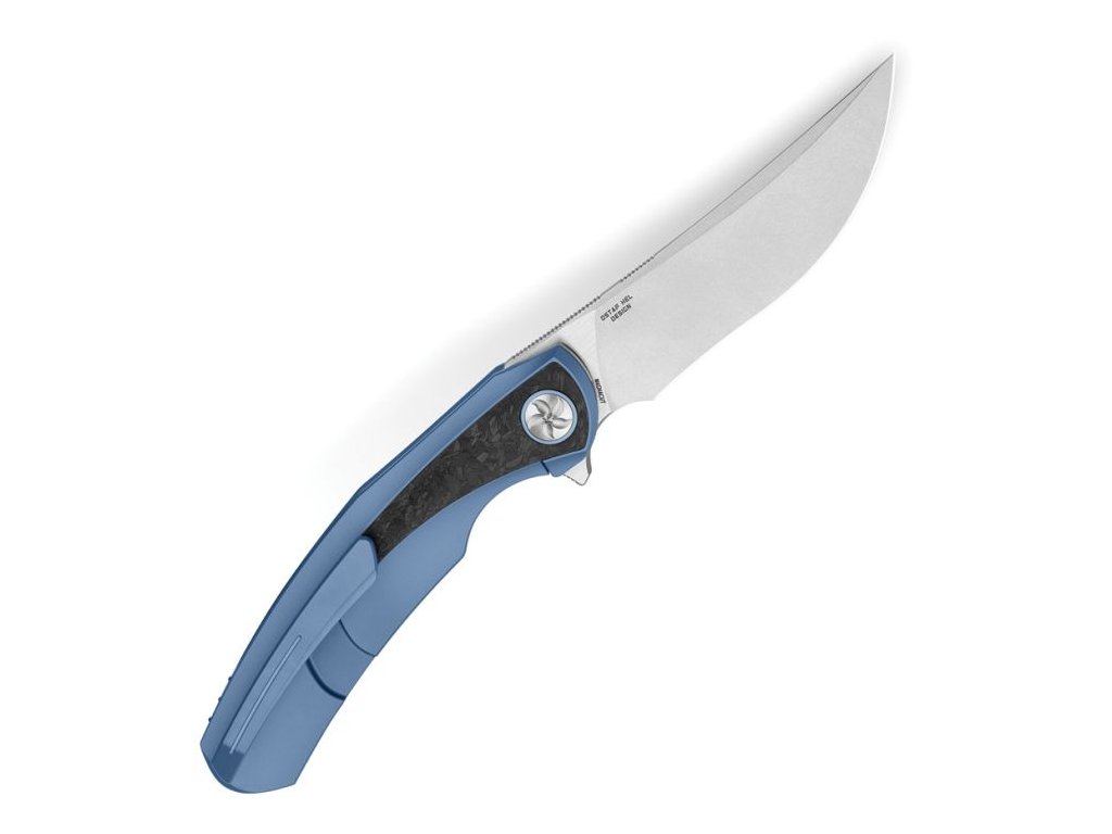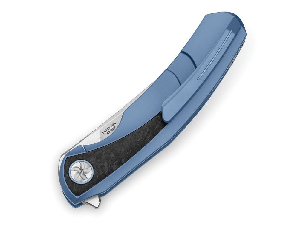 Az exkluzív Bestech Sambac Frame Lock Blue BT2402D bicska 9,2 cm pengehosszal a legmagasabb minőségű anyagokat és kiváló élességet kínálja. A penge kiváló CPM-Magna Cut rozsdamentes acélból készült, amelynek kivételes keménysége 62-63 HRC. A pengét stonewash felületkezeléssel látják el, a többi sík rész pedig szaténozott. A penge a kerámia csapágyaknak köszönhetően rendkívül könnyen nyílik, a keretzár pedig biztos zárást biztosít. A markolat teljes egészében eloxált kék titánból készült, a középső részen pedig márványozott szénszálas bevonatot alkalmaztak, ami csak fokozza a kés eleganciáját. Az eloxálás (anodizálás) eljárás kémiai-termikus felületkezelést biztosít.