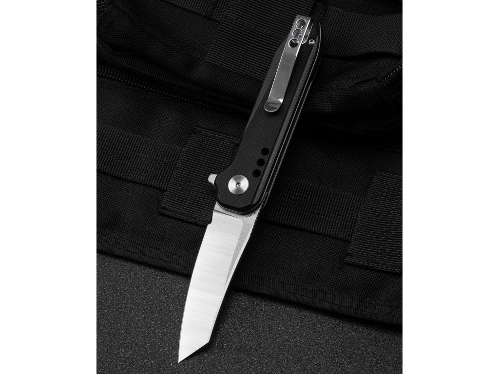 A Bestech Syntax egy elegáns, közepes méretű összecsukható kés mindennapi használatra. A penge Sandvik 14C28N rozsdamentes acélból készült, lapos élezésű, hossza 7,2 cm, és kerámia csapágyakra van felszerelve. Fekete G10 markolat. A kés liner lock zárral és acél klipsszel van felszerelve a felakasztáshoz. Egykezes nyitás flipper segítségével.