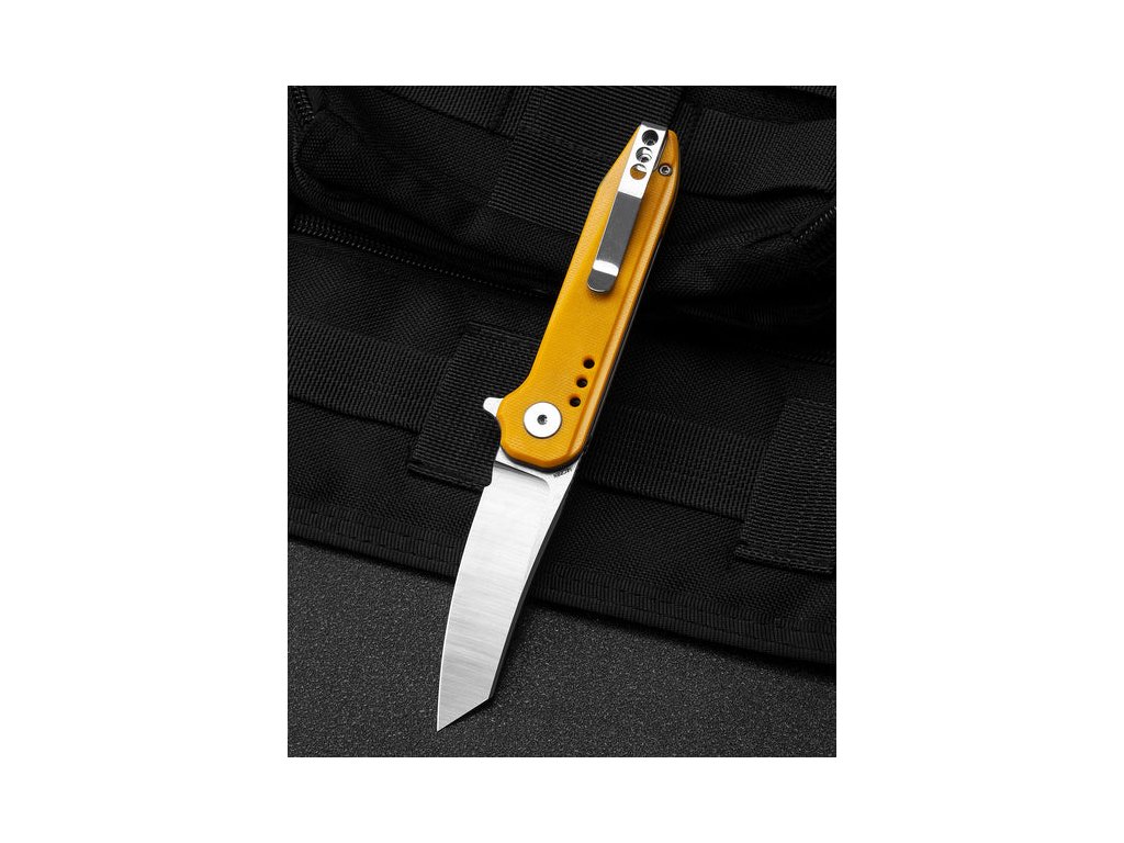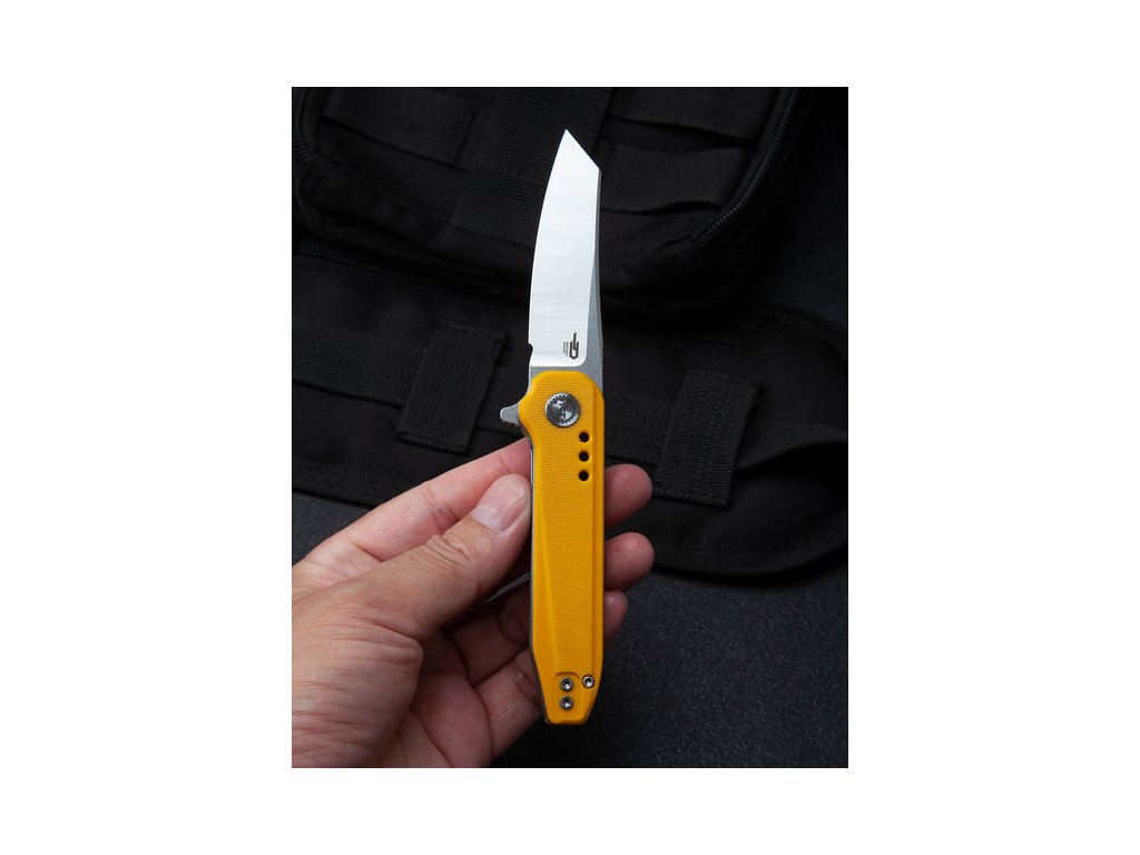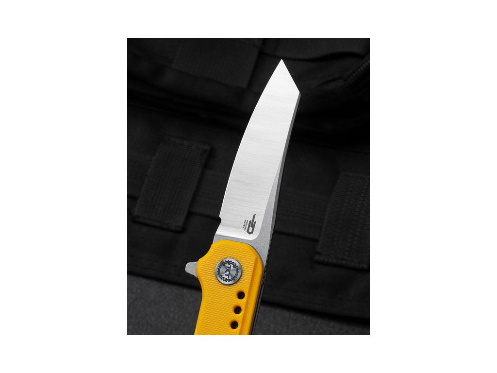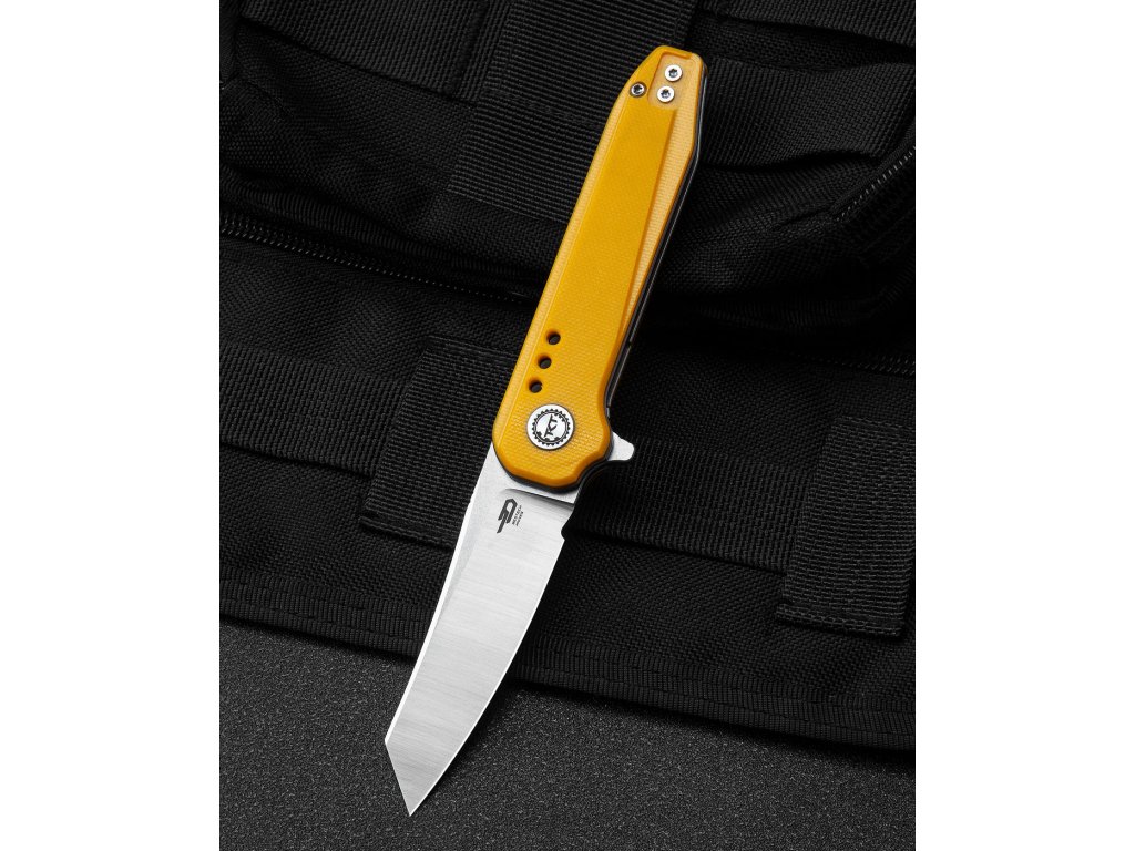 A Bestech Syntax egy elegáns, közepes méretű összecsukható kés mindennapi használatra. A penge Sandvik 14C28N rozsdamentes acélból készült, lapos élezésű, hossza 7,2 cm, és kerámia csapágyakra van felszerelve. Markolat sárga G10-ből. A kés liner lock zárral és acél klipsszel van felszerelve a felakasztáshoz. Egykezes nyitás flipper segítségével.