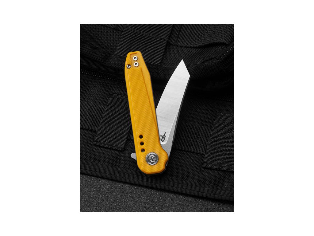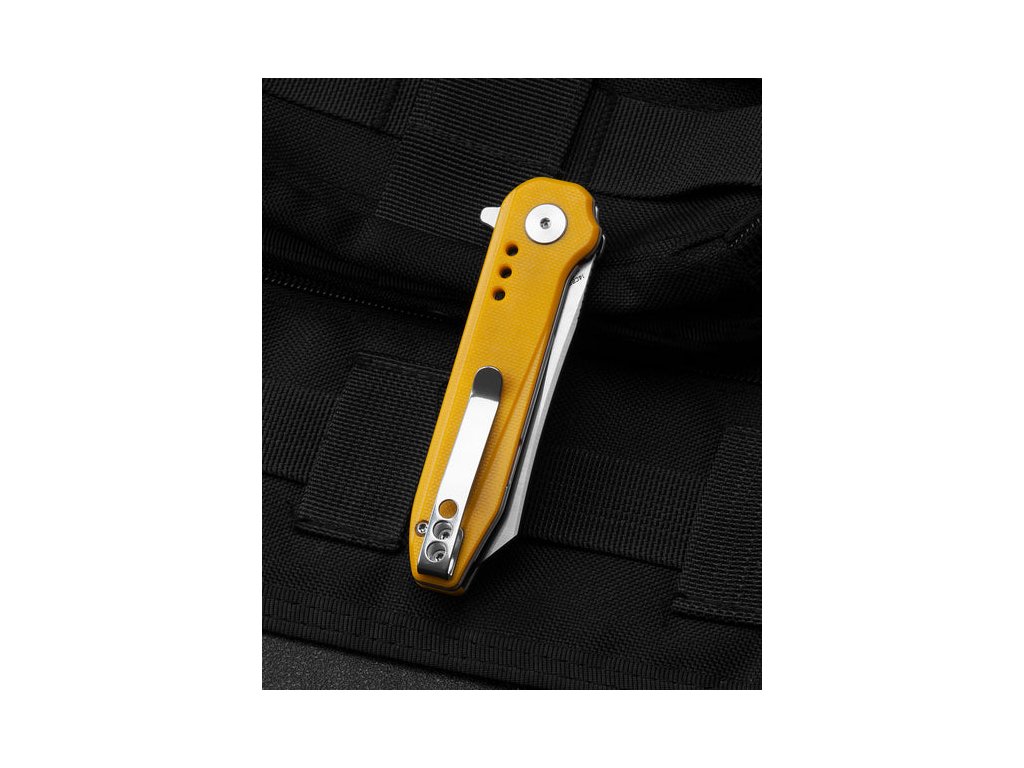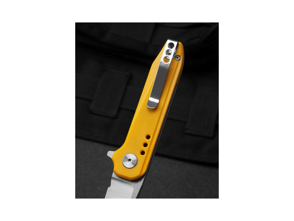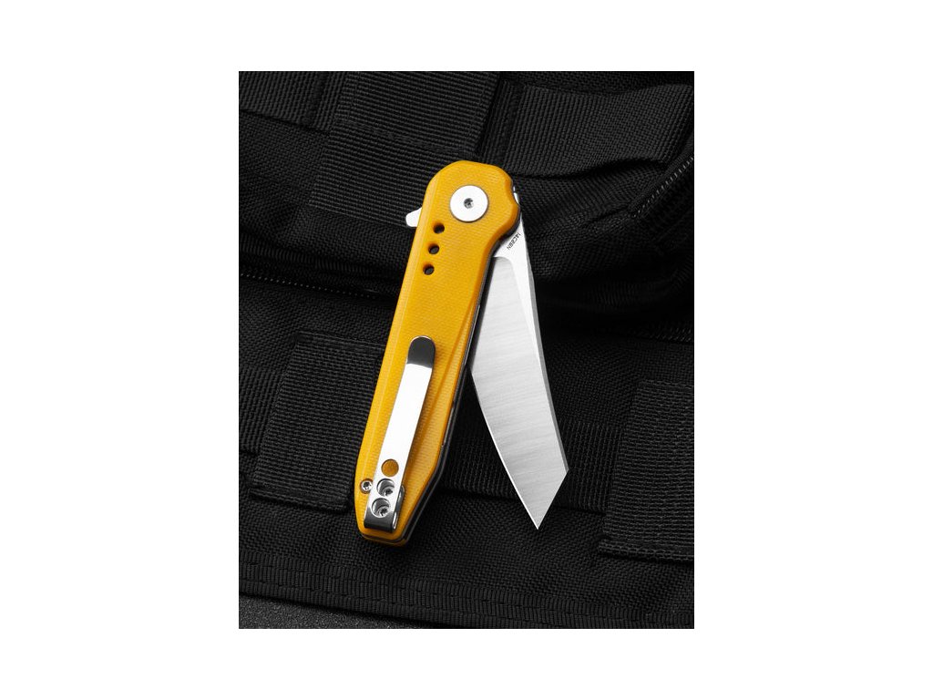 A Bestech Syntax egy elegáns, közepes méretű összecsukható kés mindennapi használatra. A penge Sandvik 14C28N rozsdamentes acélból készült, lapos élezésű, hossza 7,2 cm, és kerámia csapágyakra van felszerelve. Markolat sárga G10-ből. A kés liner lock zárral és acél klipsszel van felszerelve a felakasztáshoz. Egykezes nyitás flipper segítségével.