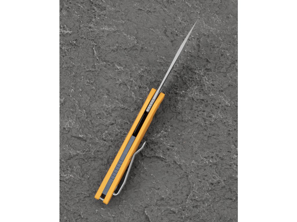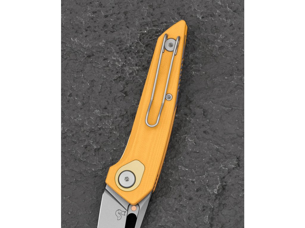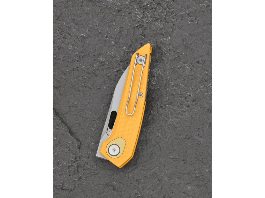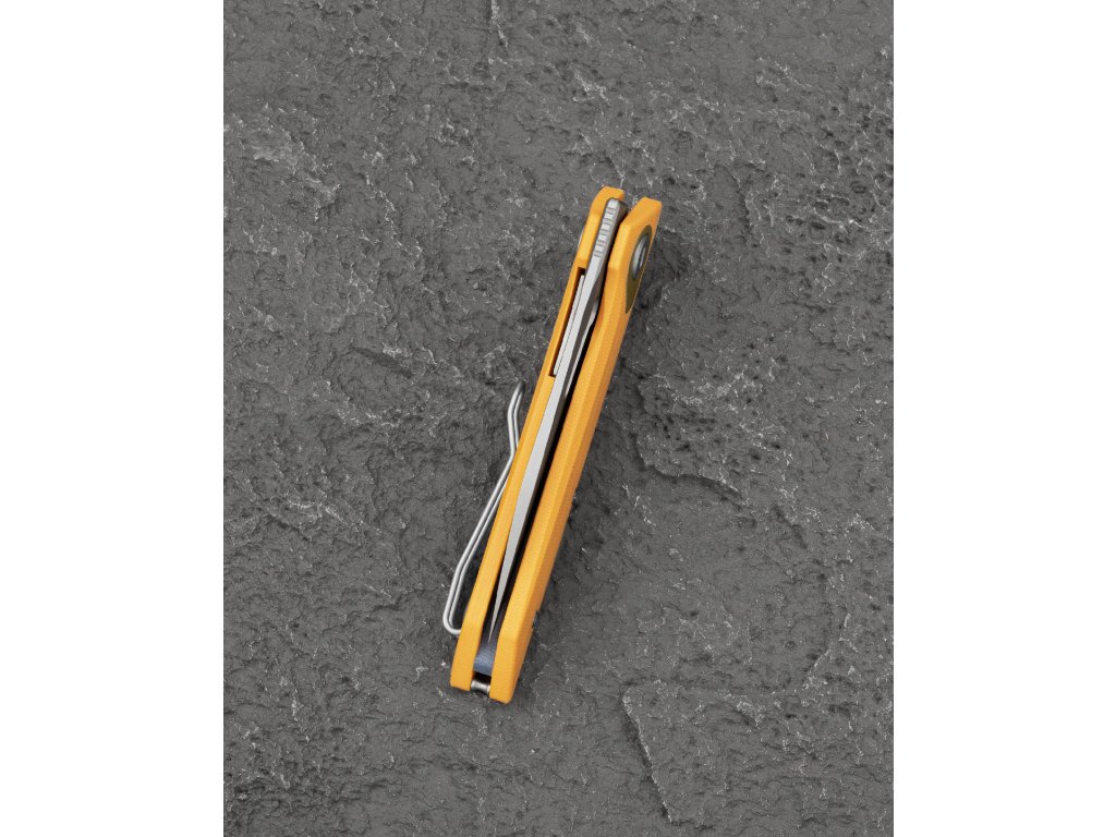 A sárga G10 markolat textúrázott felülettel rendelkezik, amely biztos fogást nyújt. A markolat hossza 10,81 cm. A kés penge kivágás (thumb hole) segítségével nyitható, a Liner Lock zárszerkezet pedig biztonságosan rögzíti a pengét nyitott állapotban. A zsebkés Tip-Up zsebcsipesszel van ellátva, amely jobbkezes használatra alkalmas. Teljes hossz: 18,06 cm. Súly: 82 g.