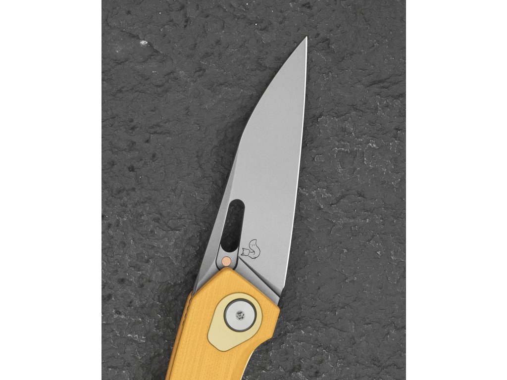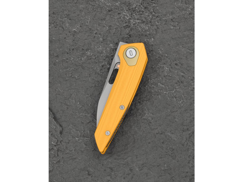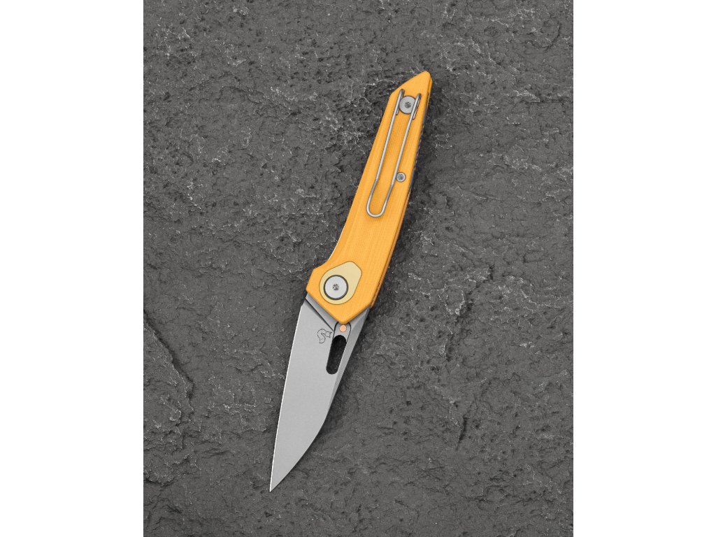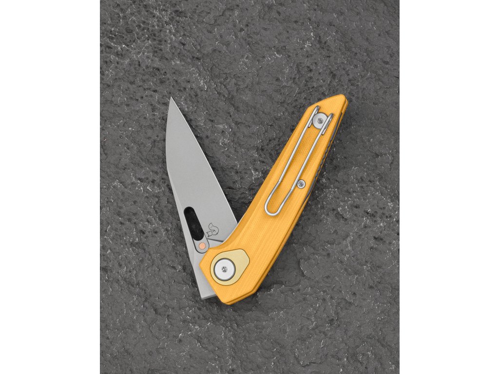 A sárga G10 markolat textúrázott felülettel rendelkezik, amely biztos fogást nyújt. A markolat hossza 10,81 cm. A kés penge kivágás (thumb hole) segítségével nyitható, a Liner Lock zárszerkezet pedig biztonságosan rögzíti a pengét nyitott állapotban. A zsebkés Tip-Up zsebcsipesszel van ellátva, amely jobbkezes használatra alkalmas. Teljes hossz: 18,06 cm. Súly: 82 g.