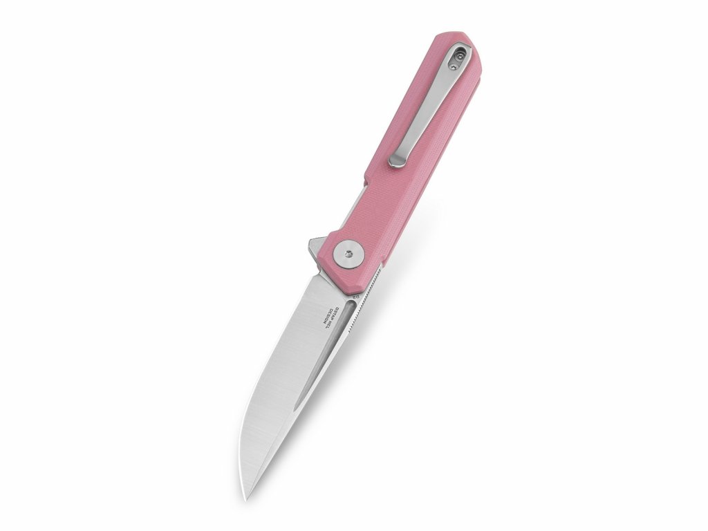 A rózsaszín G10 markolatú pengék finom textúrájúak és kényelmes érzést nyújtanak a kézben. A Mini Dundee liner lockkal és megfordítható zsebcsipesszel van felszerelve. A penge nagyon könnyen és simán mozog a kerámia csapágyaknak köszönhetően. A flipperrel való nyitáshoz csak egy ujjra van szükség, így a nyitás nagyon kényelmes és gyors.