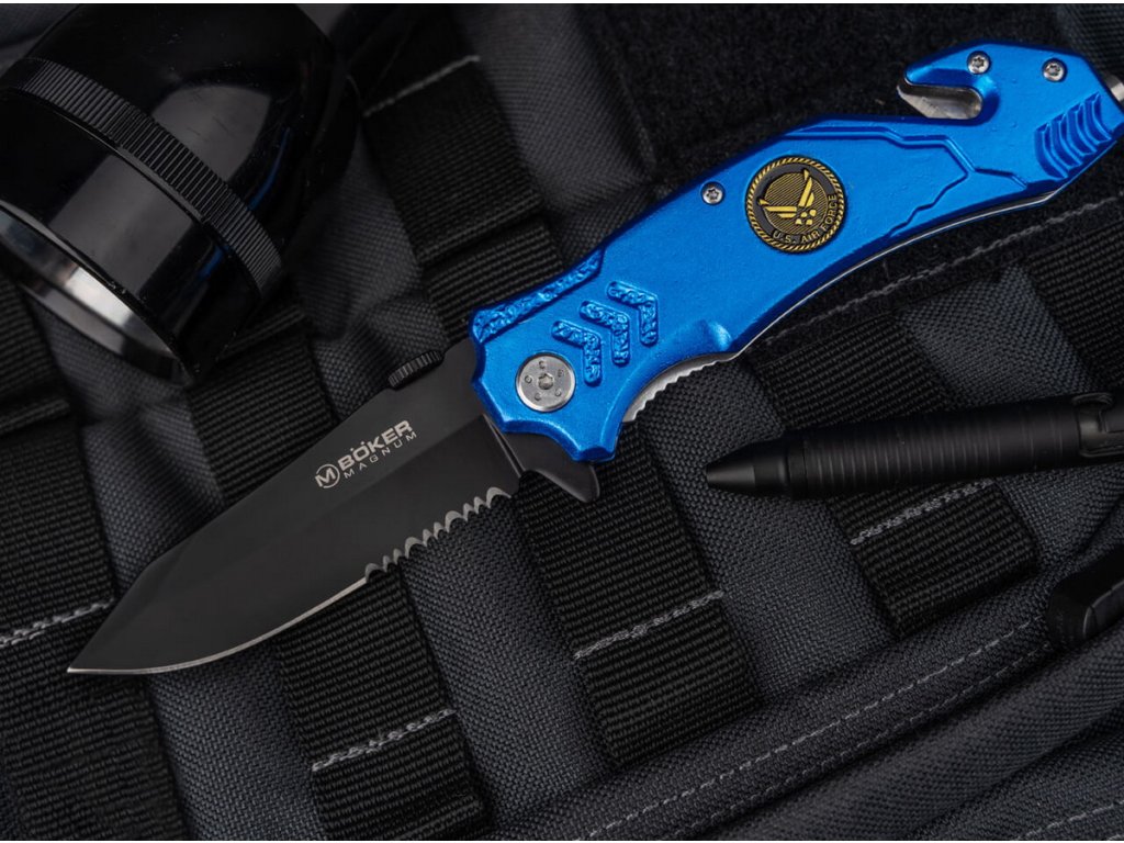A kék eloxált alumínium markolat rendkívül masszív, és a légierő szimbólumával díszített. A kés zsebcsipesszel, biztonsági övvágóval és üvegtörőheggyel van felszerelve, ami vészhelyzetekben nagyon hasznos lehet.