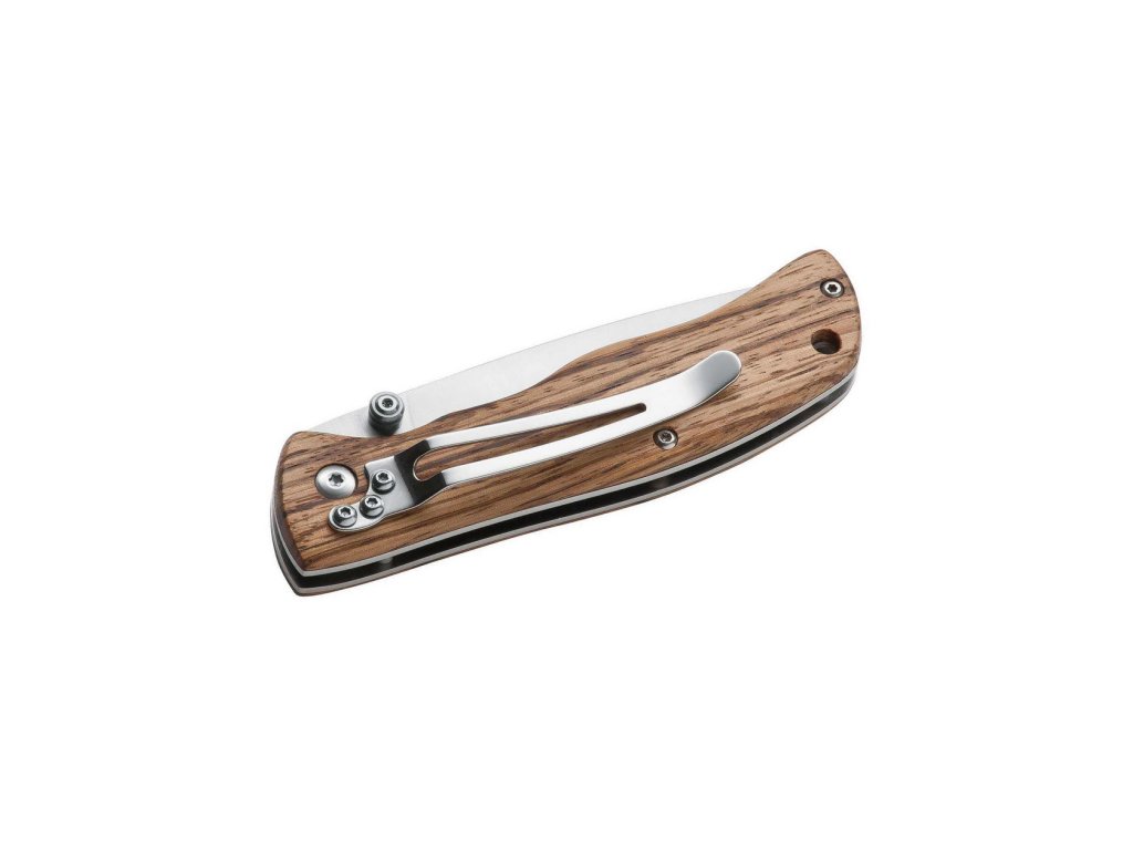 Zsebkés 440A rozsdamentes acélból készült pengével, finom szatírozással és lapos élezéssel. A kés a pengén lévő csapszeggel nyílik, és egy bélészárral van rögzítve. Az elegáns fa markolat zsebcsipesszel és a zsinór befűzéséhez szükséges lyukkal van ellátva.