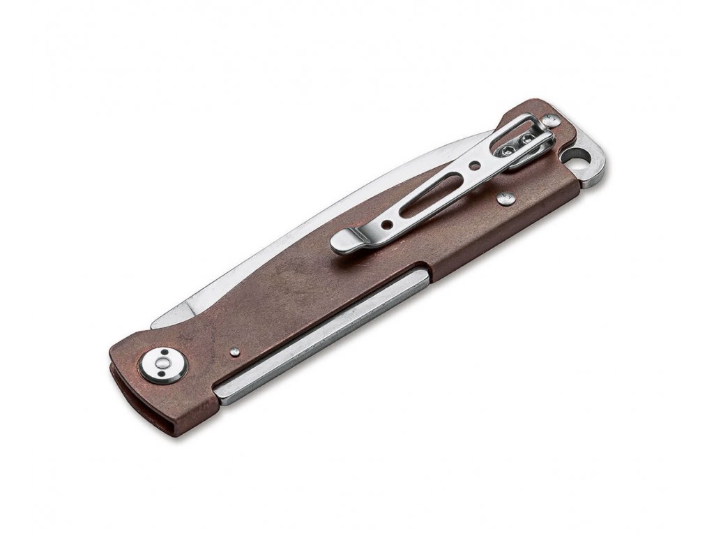 Egyszerű összecsukható kés réz markolattal. A Böker Plus Atlas Copper könnyű, vékony, viselése közben alig érezni. A 7 cm hosszú Sandvik 12C27 rozsdamentes acél penge körömlyukkal nyílik. Réz markolat, amely idővel és használat közben patinásodik. A kés klippel van ellátva a felakasztáshoz.