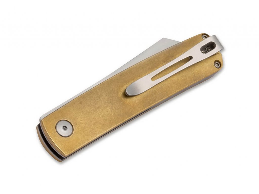 Elegáns, rendkívül vékony gentleman kés kompakt méretekkel, amelyek tökéletes kompromisszumot jelentenek a zsebbe helyezhetőség és a sokoldalúság között. A késnek külön a távol-keleti elemei vannak. A japán VG-10 rozsdamentes acélból készült 6,8 cm hosszú penge lapos élezésű és matt felületű. Nyitás a pengén található gomb segítségével. A nyitás nagyon sima a használt golyóscsapágyaknak köszönhetően. A sárgaréz nyél eleganciát kölcsönöz a késnek. A sárgaréz idővel és használat közben patinásodik, ami kissé megváltoztatja a markolat színét. A kés liner lock zárral, felakasztáshoz klipszel és kiváló minőségű nejlon tokkal van felszerelve a tároláshoz.