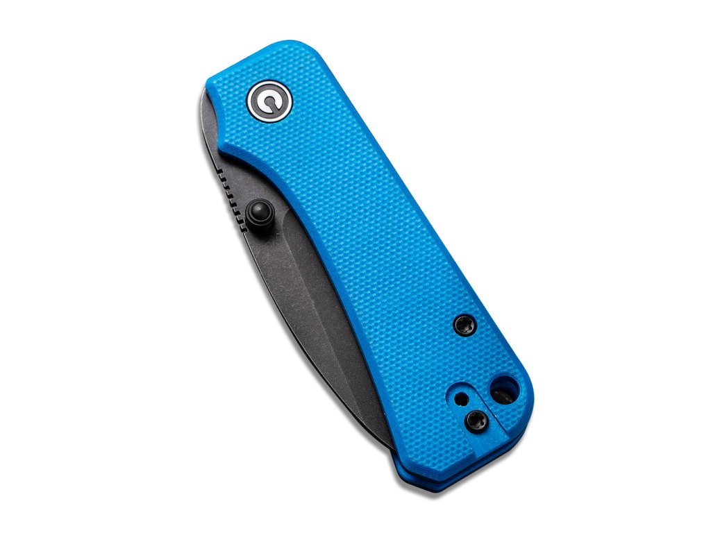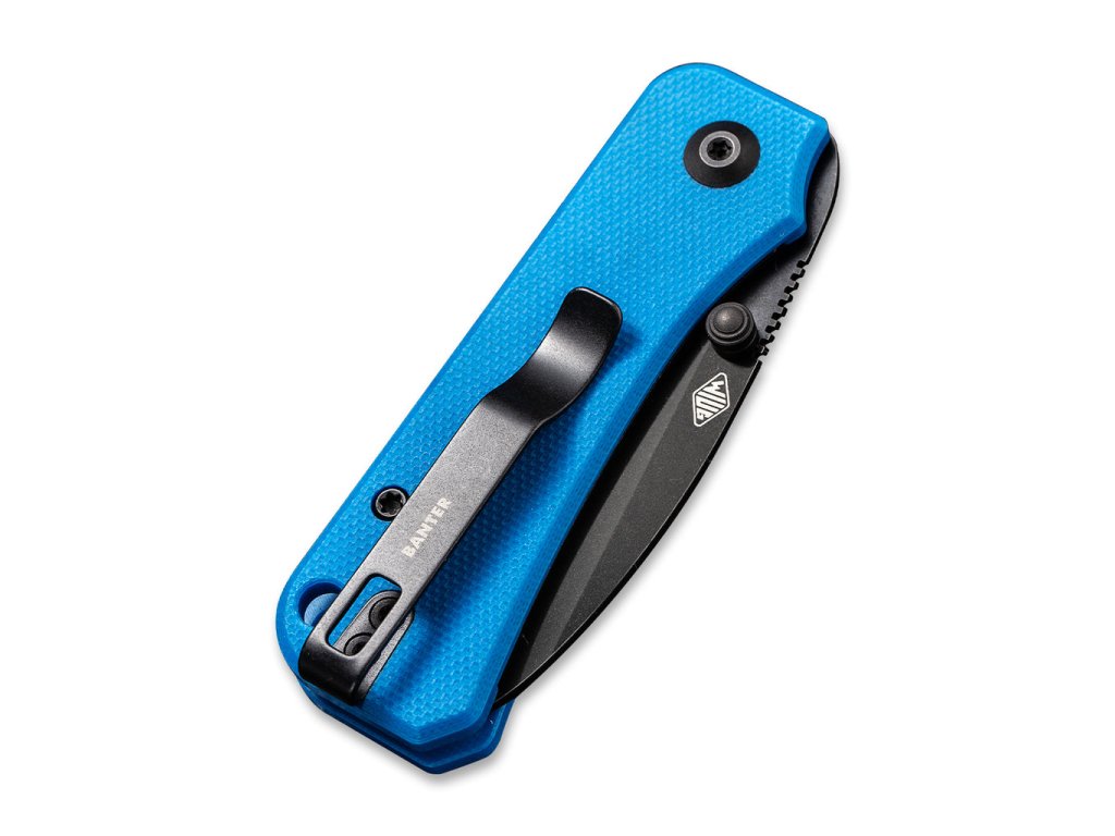 A Civivi Baby Banter C19068S-3 zsebkés nagyszerű eszköz a mindennapi használatra. Már az első használat után beleszeret a kisebb méretbe és a magas funkcionalitásba. Az 5,9 cm hosszú penge Nitro V rozsdamentes acélból készült, drop point alakú és fekete stonewash felülettel. A kés reteszelése a linerlock mechanizmusnak köszönhetően jól biztosított. A markolat G-10 anyagból készült, színes kék színben. A kés kinyitása nagyon egyszerű és sima, a penge kerámia csapágyakra van helyezve. Csak egy kézzel kell kinyitni a kést a csap segítségével. A kés kétoldalas rozsdamentes acél akasztókapcsot tartalmaz.