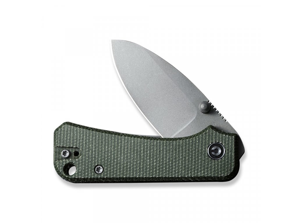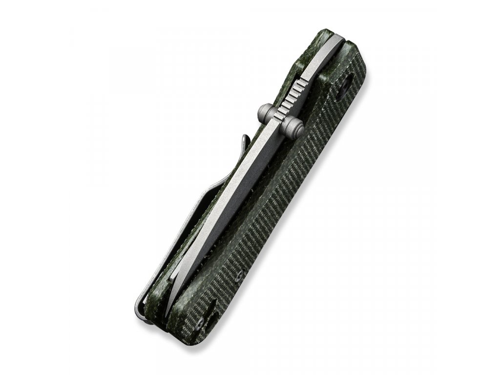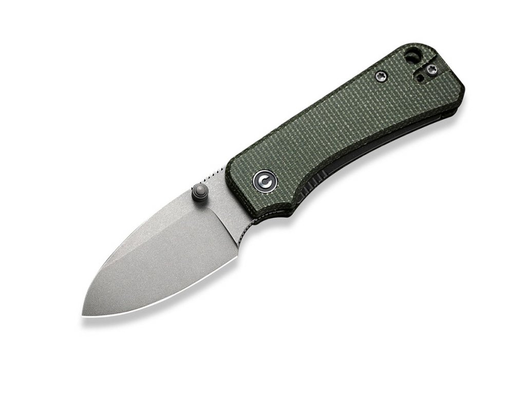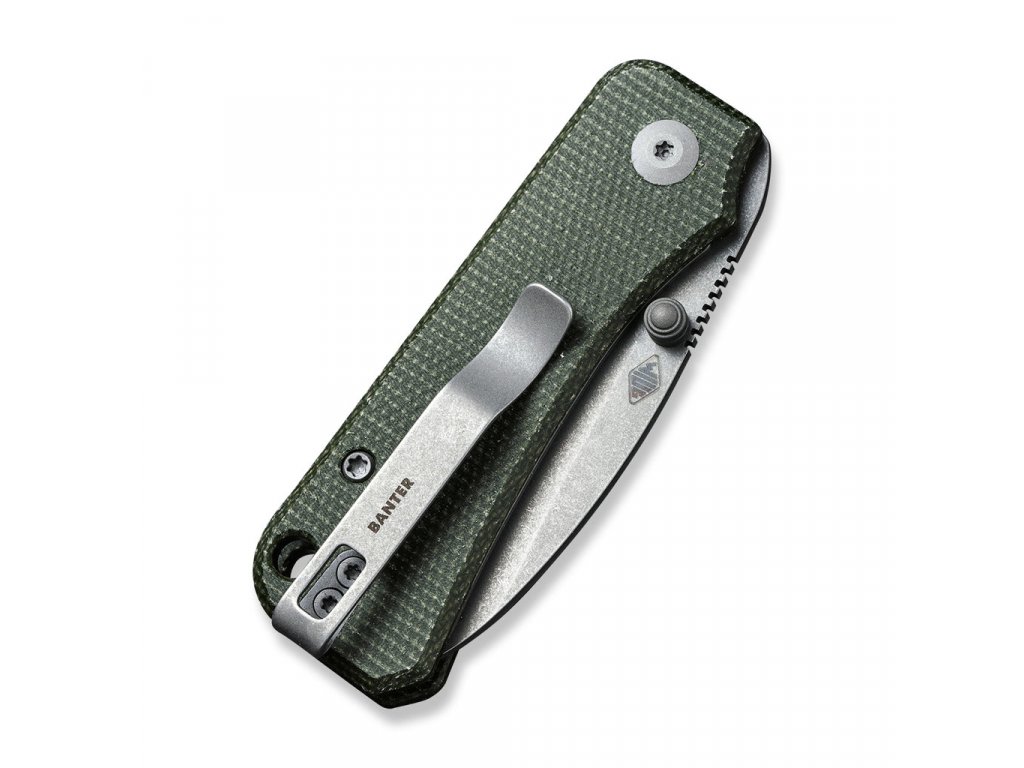 A Civivi Baby Banter C19068SB-1 zsebkés nagyszerű eszköz a mindennapi használatra. Már az első használat után beleszeret a kisebb méretbe és a magas funkcionalitásba. Az 5,9 cm hosszú penge Nitro V rozsdamentes acélból készült, drop point alakú, szürke stonewash felülettel. A kés reteszelése a linerlock mechanizmusnak köszönhetően jól biztosított. A nyél zöld micartából készült. A kés kinyitása nagyon egyszerű és sima, a penge kerámia csapágyakra van helyezve. Csak egy kézzel kell kinyitni a kést a csap segítségével. A kés kétoldalas rozsdamentes acél akasztókapcsot tartalmaz.