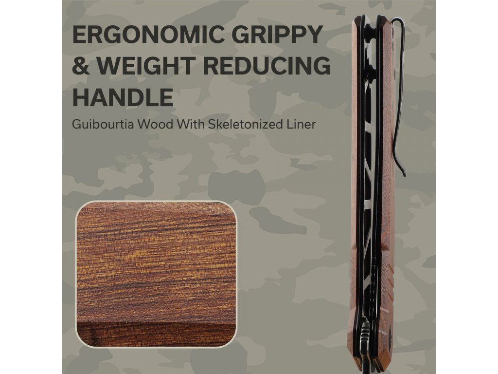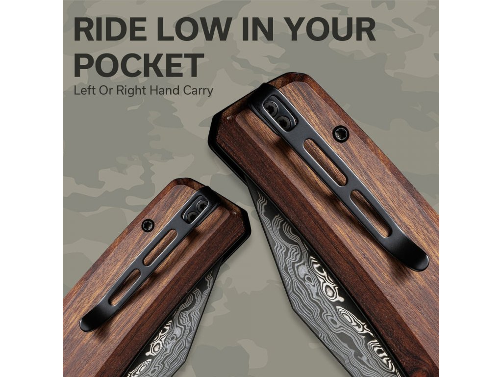 A kés teljes hossza nyitott állapotban 23,2 cm, csukott állapotban pedig 13,1 cm. Ezek a 13,1 cm érezhetően érezhetőek a Guibourtia fa markolatban. A Guibourtia a Fabaceae családba tartozó virágos növény, amely olyan közismert neveken is ismert, mint a rodéziai kopálfa, afrikai rózsafa, amazique, bubinga, kevazingo és ovangkol. A fogantyú egy rozsdamentes acél Tip-Up klipszet is tartalmaz a felakasztáshoz, amely egyszerűsített hordozást biztosít a Bhaltair Damaszkusz teljes 156 grammos súlyához. A Civivi Bhaltairrel biztosan növelni fogja az EDC késhasználat eddig megszokott szintjét.