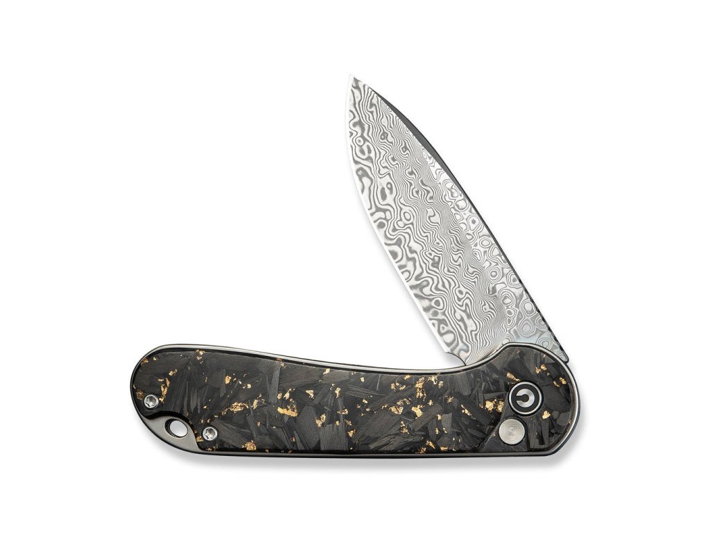 A 7,5 cm hosszú, drop point formájú penge kiváló minőségű rozsdamentes damaszk acélból készült, üreges leélezéssel. A damaszk acél elegáns mintázata különösen esztétikus megjelenést kölcsönöz a késnek. A markolat szénszálas anyagból készült, áttetsző gyantába ágyazott aranyszínű részecskékkel, amely nemcsak tartós, hanem látványos is.