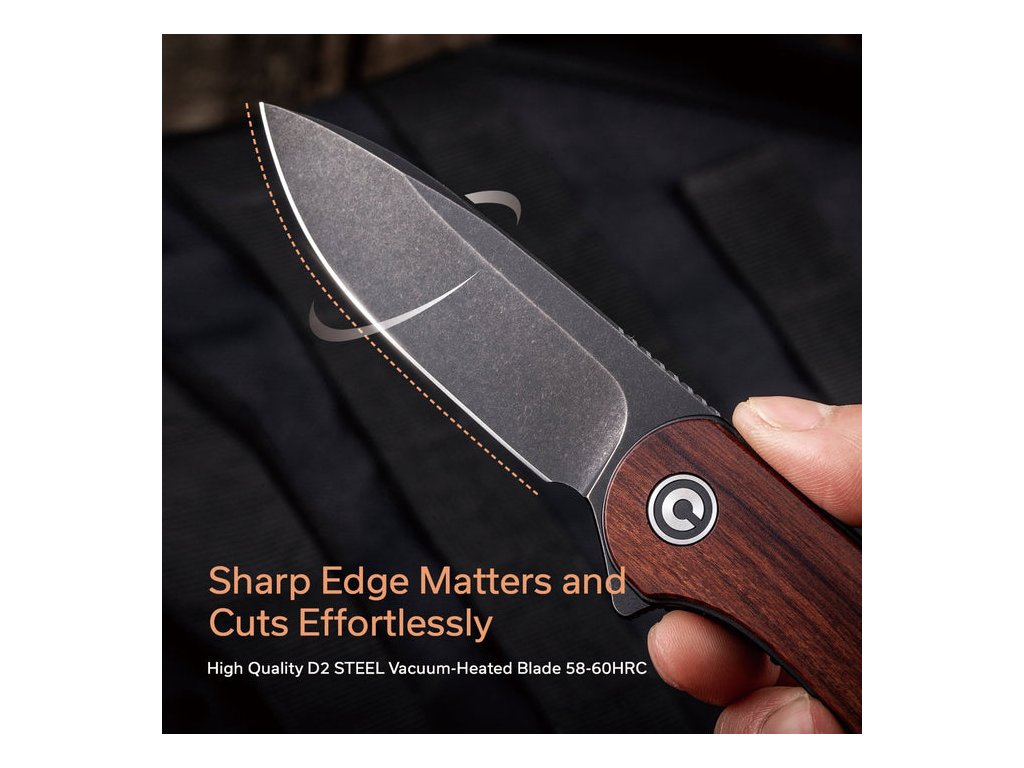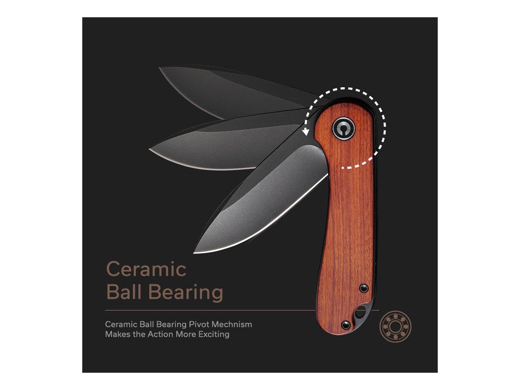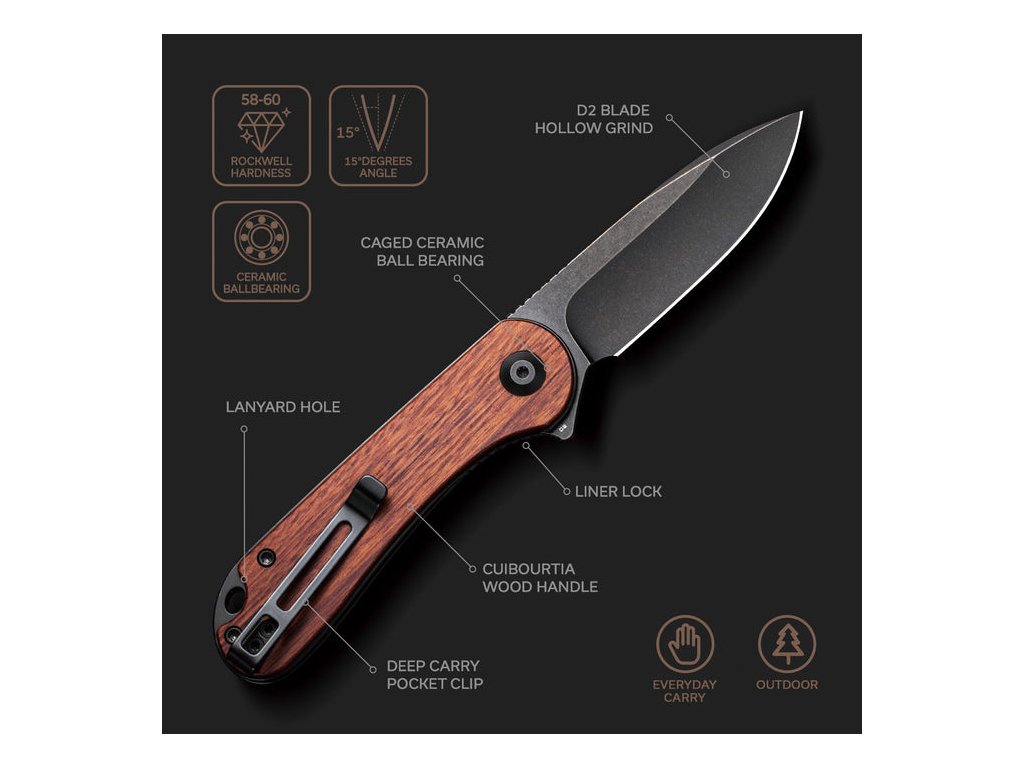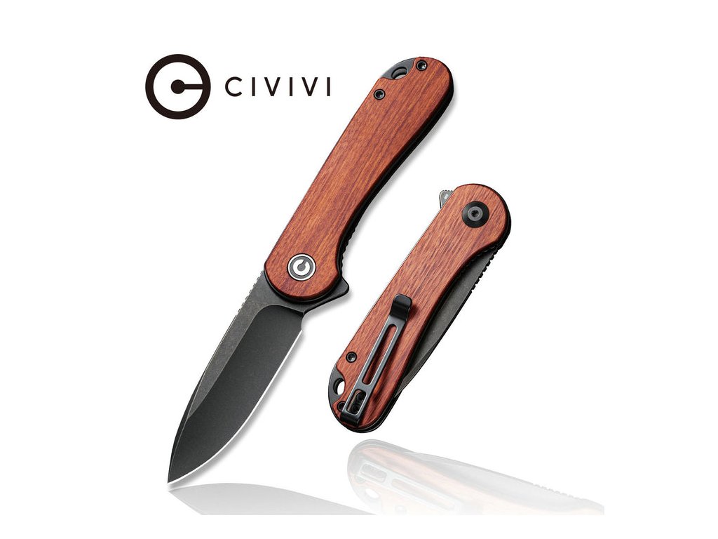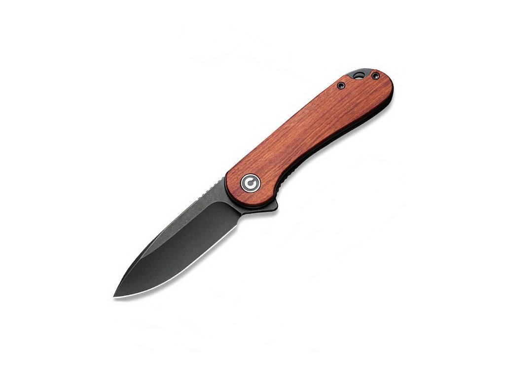Egy összecsukható kés, amely lenyűgöz egyszerű kialakításával és feldolgozásának minőségével. A Civivi Elementum egy kisebb, elegáns EDC kés egy kis luxussal, amit a felhasznált anyagok adnak meg neki. Penge szerszámacélból D2 keménység 58-60 HRC fekete stonewash felületkezeléssel és holkeres élezésű. A penge liner lock zárral van rögzítve. Az egzotikus Cuibourtia fából készült nyél fényűző és elegáns megjelenést kölcsönöz a késnek. Rozsdamentes acél kés akasztócsipesz. Az egykezes nyitást a flipper biztosítja. A kés kinyitása nagyon egyszerű és sima, a penge kerámia csapágyakra van helyezve.