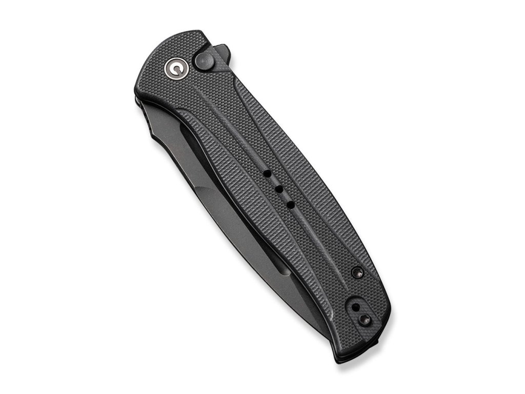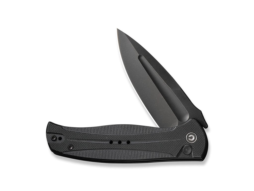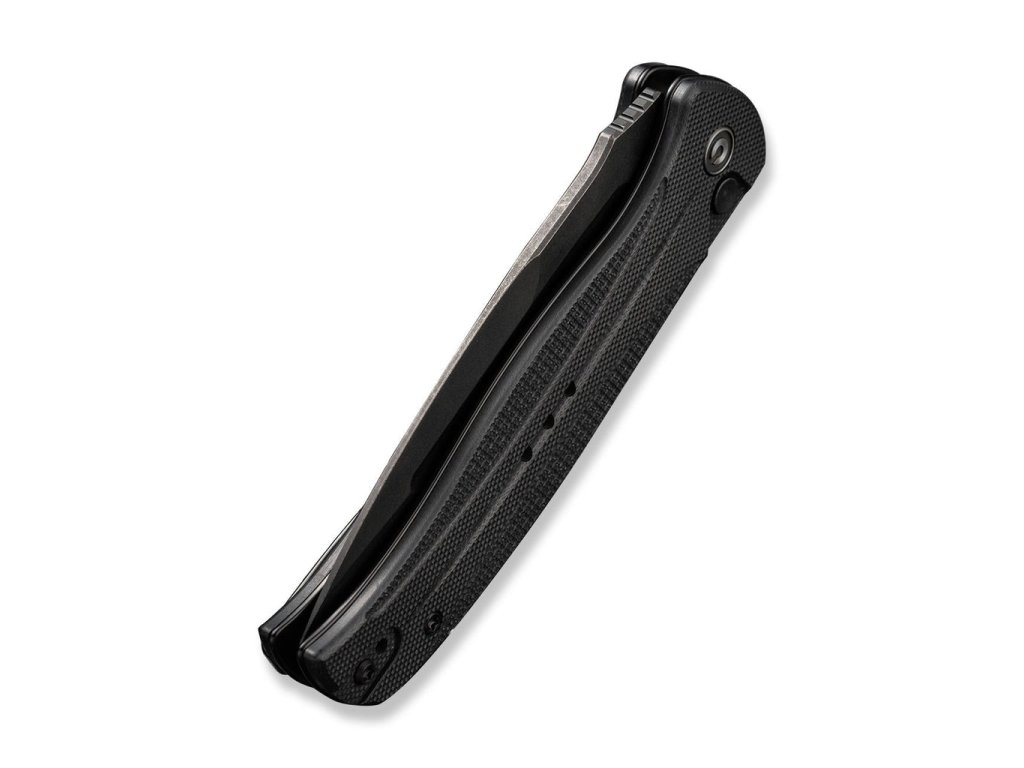 A 11,3 cm hosszú markolat fekete G10-ből készült, és kényelmes fogást garantál, amely nem fárasztja a kezet. Nyitása flipperrel vagy nyomógombbal történik, a kést pedig gombzárral rögzítik, ami lehetetlenné teszi a véletlen nyitást. A kés kerámia golyóscsapágyakkal rendelkezik, amelyek biztosítják a kés zökkenőmentes és tartósan problémamentes működését.