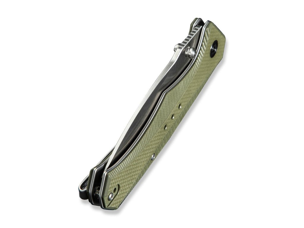 A 13,2 cm hosszú, zöld G10 markolat kényelmes fogást biztosít, amely nem fárasztja el a kezet. A texturált felület nagy előnyt jelent, mivel biztosabb fogást nyújt. A nagyobb markolat különösen alkalmas nagyobb kézmérettel rendelkező felhasználók számára. A kést flipperrel vagy pengeoldali pöckökkel lehet nyitni. A kés liner lock zárral rendelkezik. A kerámia golyóscsapágyak sima és hosszú távon megbízható működést biztosítanak.
