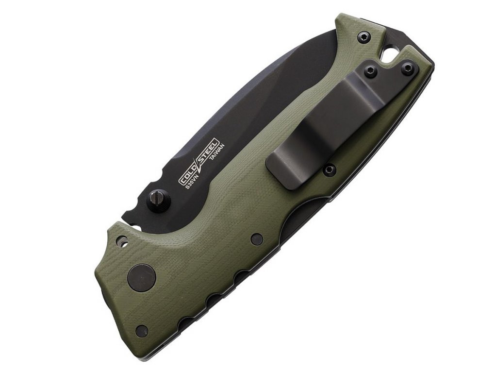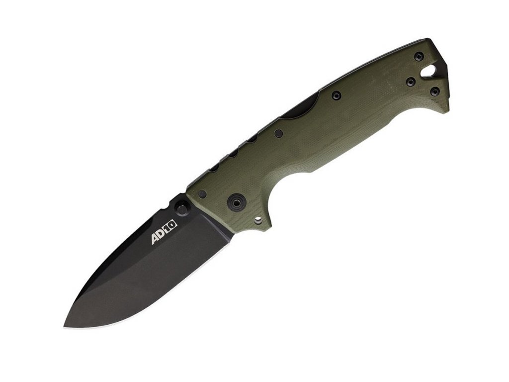 A Cold Steel AD 10 egy nagy és masszív összecsukható kés, amelyet nehéz feladatok kezelésére alakítottak ki. Az első osztályú CPM S35VN rozsdamentes acélból készült penge rendkívül éles és egyben ellenáll a sérüléseknek. A penge fekete felülettel és lapos élezéssel rendelkezik. Olívazöld G10 markolat. A kést egy Tri-Ad zár rögzíti, amely a legerősebb biztonsági típusnak számít a záródó késeknél.Klip akasztható rozsdamentes acél kés mindkét oldalán (jobbra/balra) megfordítható.  ;Egykezes nyitás csapokkal a pengén. A kés egy jól ismert késszakértő, Andrew Demko műhelyéből származik.