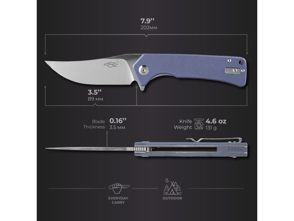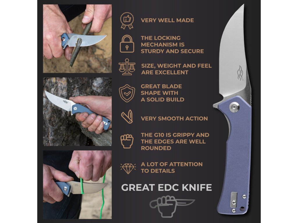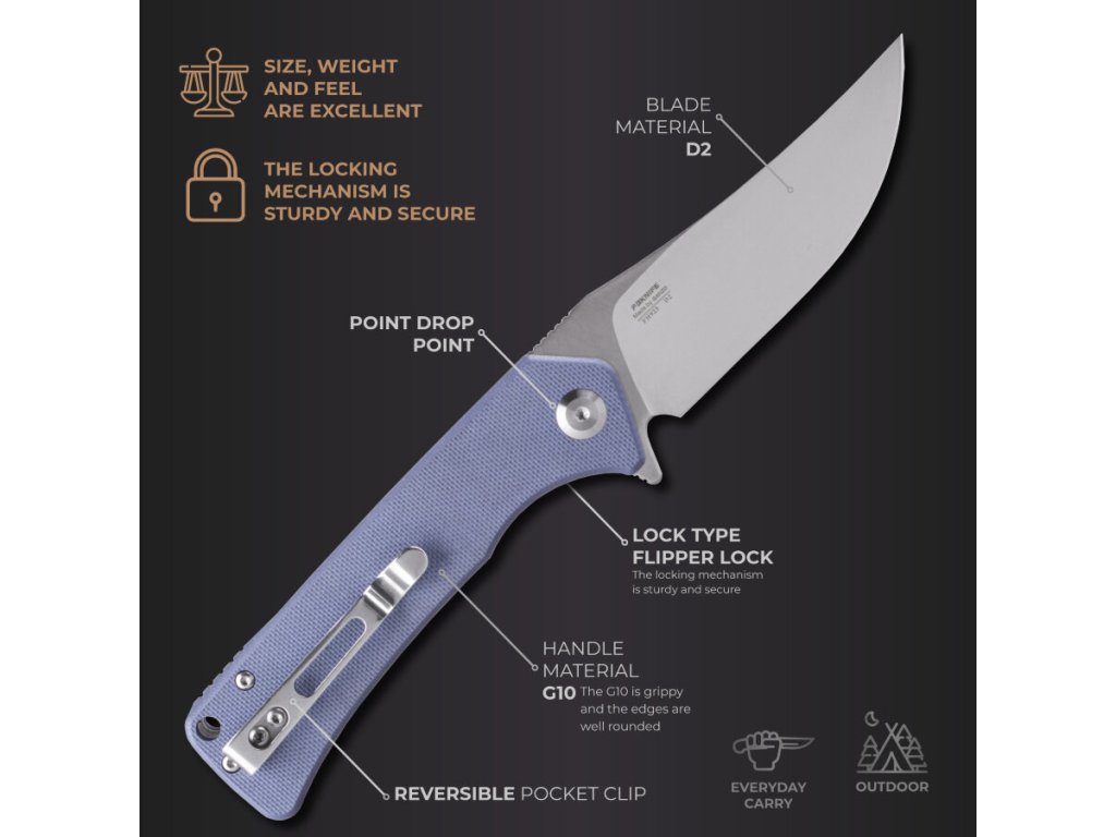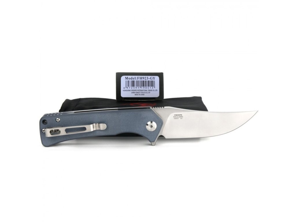 A Ganzo Firebird FH923-GY zsebkés mindennapi használatra (EDC) alkalmas. A penge D2 szerszámacélból készült, 59–61 HRC keménységűre edzett. A penge trailing point alakú, sima élköszörüléssel.