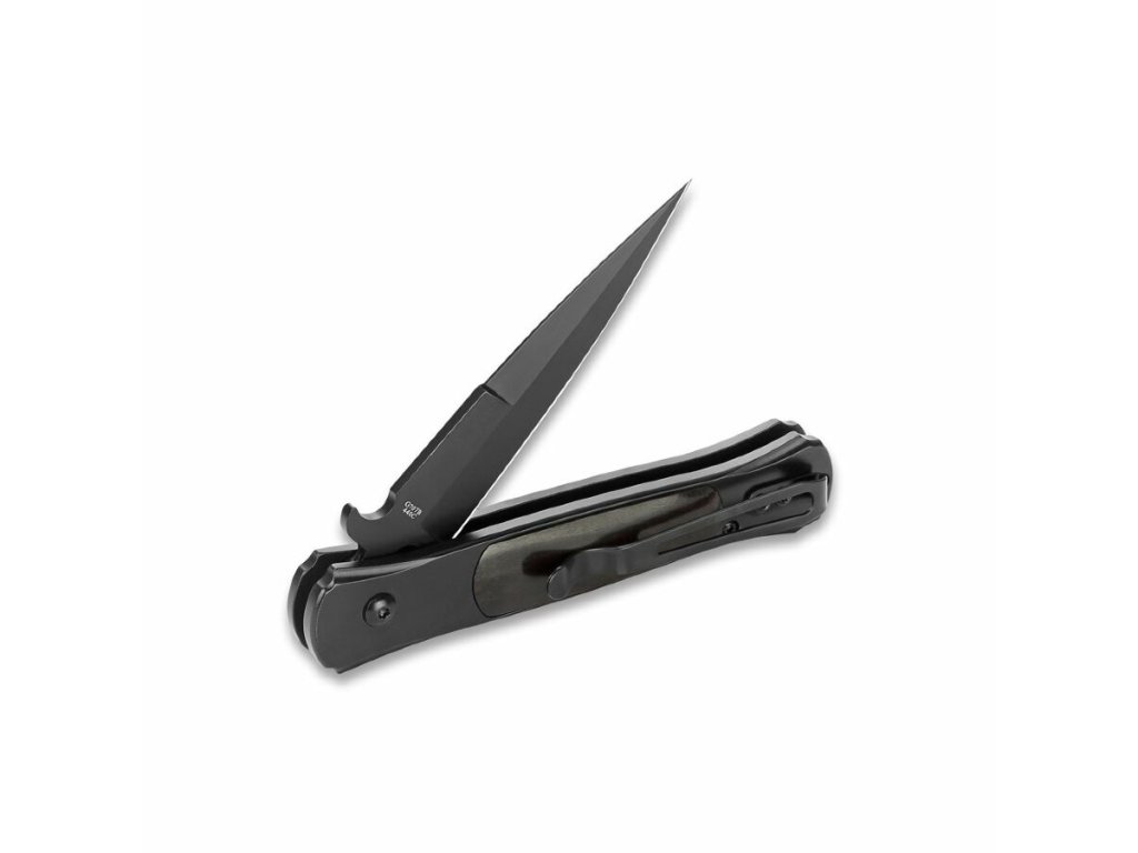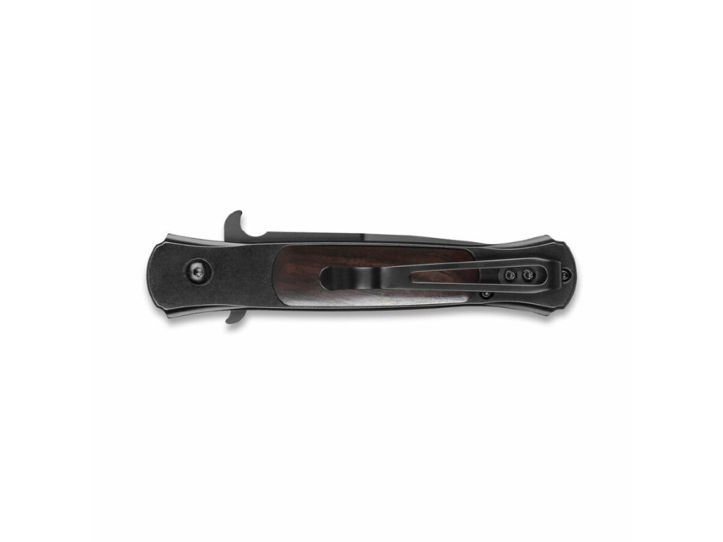 A markolat fekete színű G10 és barna fa kombinációjából készült. A kés automatikusan nyílik, nyitott állapotban pedig Button Lock zár rögzíti a pengét. A markolat végén csíptető található. A penge hossza 9 cm, vastagsága 3 mm, a teljes hossz 20,5 cm. A kés súlya 133 g.