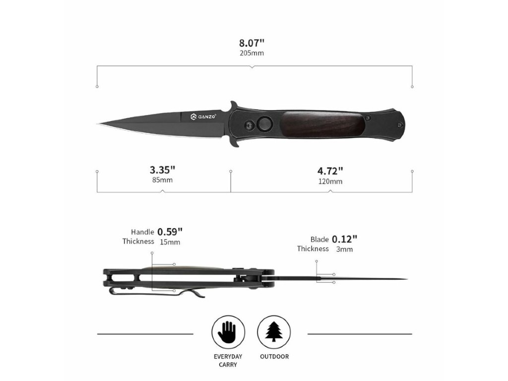A Ganzo G707B zsebkés ideális mindennapi használatra (EDC) és szabadtéri tevékenységekhez. Pengéje 440C rozsdamentes acélból készült, 58 HRC keménységre edzett. A penge spear point formájú, lapos leélezéssel.